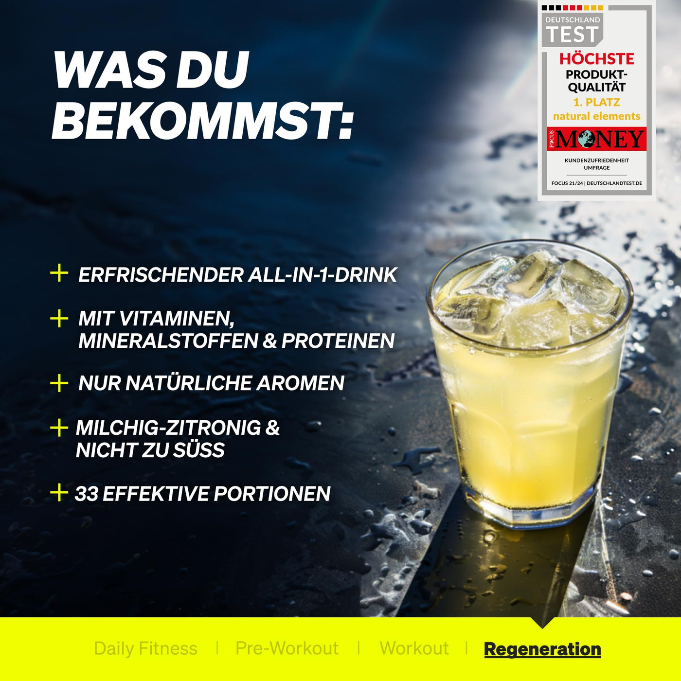 Recovery Drink Lemon - 1000g - regeneration drink with maltodextrin, whey protein, creatine, EAAs, L-glutamine, vitamins and minerals - magnesium and zinc - produced in Germany