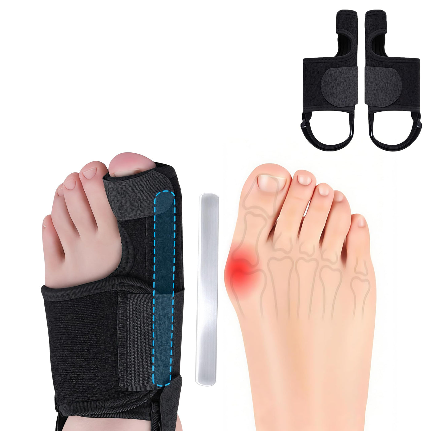 - Guided Toe Positioning Engineered with integrated aluminum splints, this bunion brace gently encourages natural toe spacing and alignment. Designed to support healthy foot posture during daily wear.