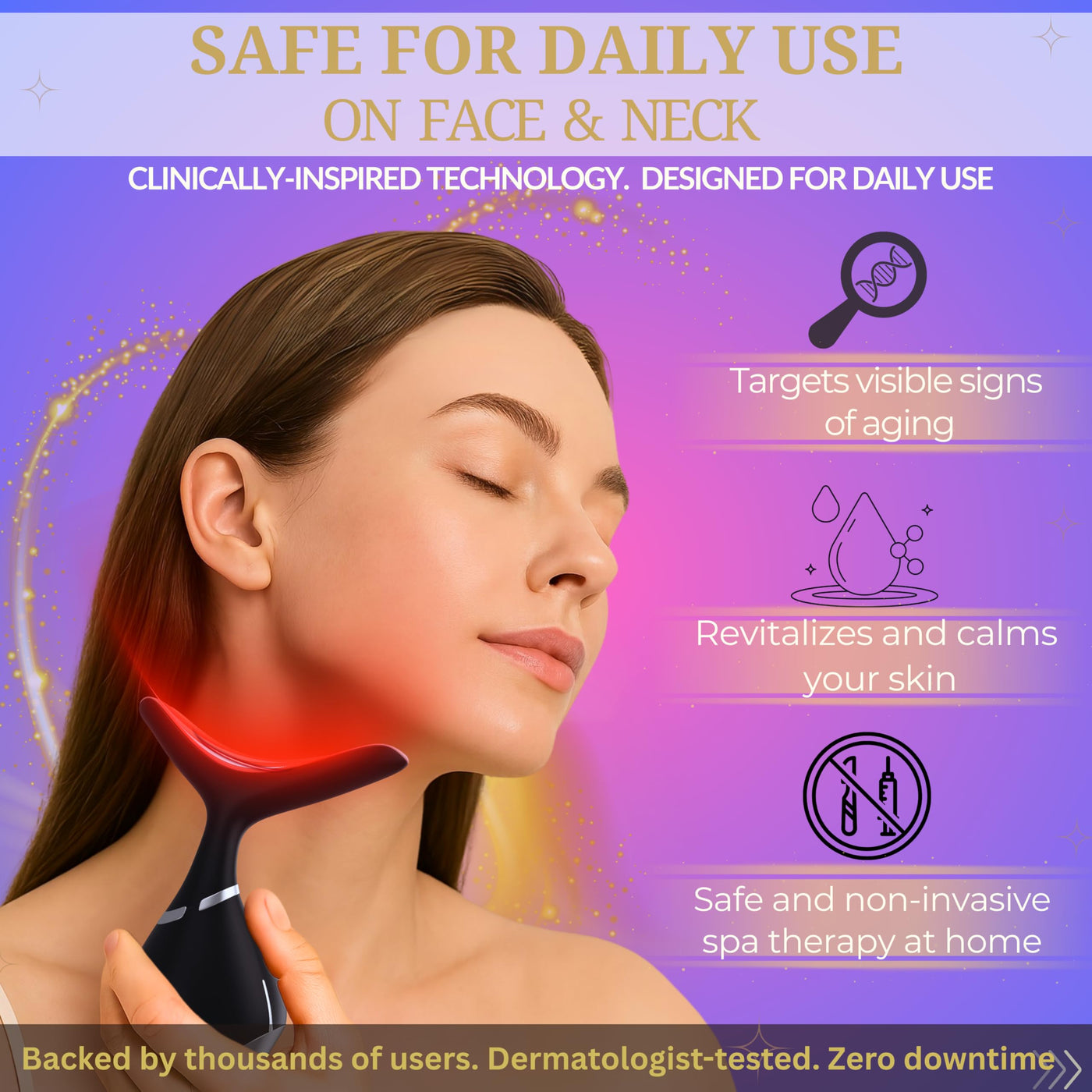 - Lift, Firm, and GlowAll in One This advanced 3-in-1 skincare tool combines red light therapy, soothing heat, and gentle vibration to support smoother, firmer-looking skinespecially around the jawline and neck where aging often shows first.