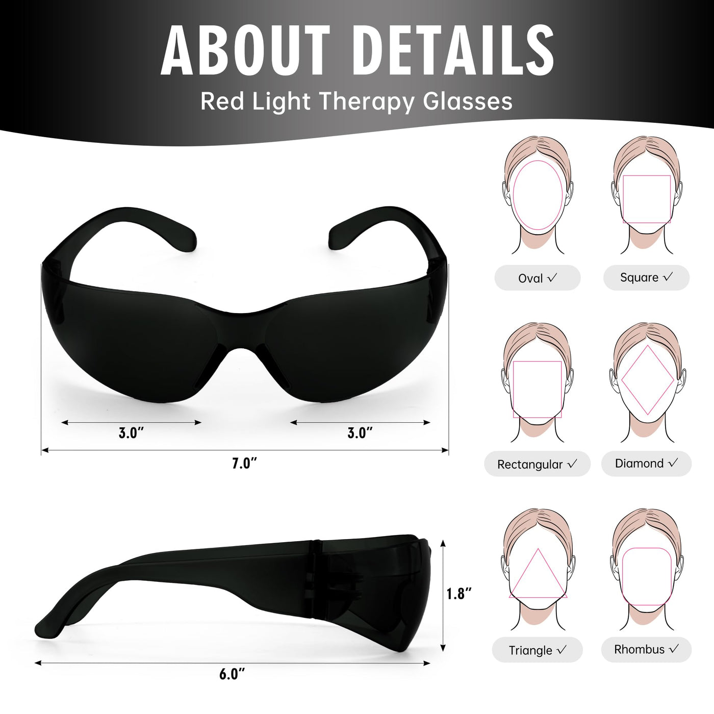 - Stylish DesignOur red light therapy sunglasses are more in line with the trend in design. The classy frame design providing 360 protection from strong light stimulation. Laser safety glasses goes well with almost all kinds of faces among men and women both.
