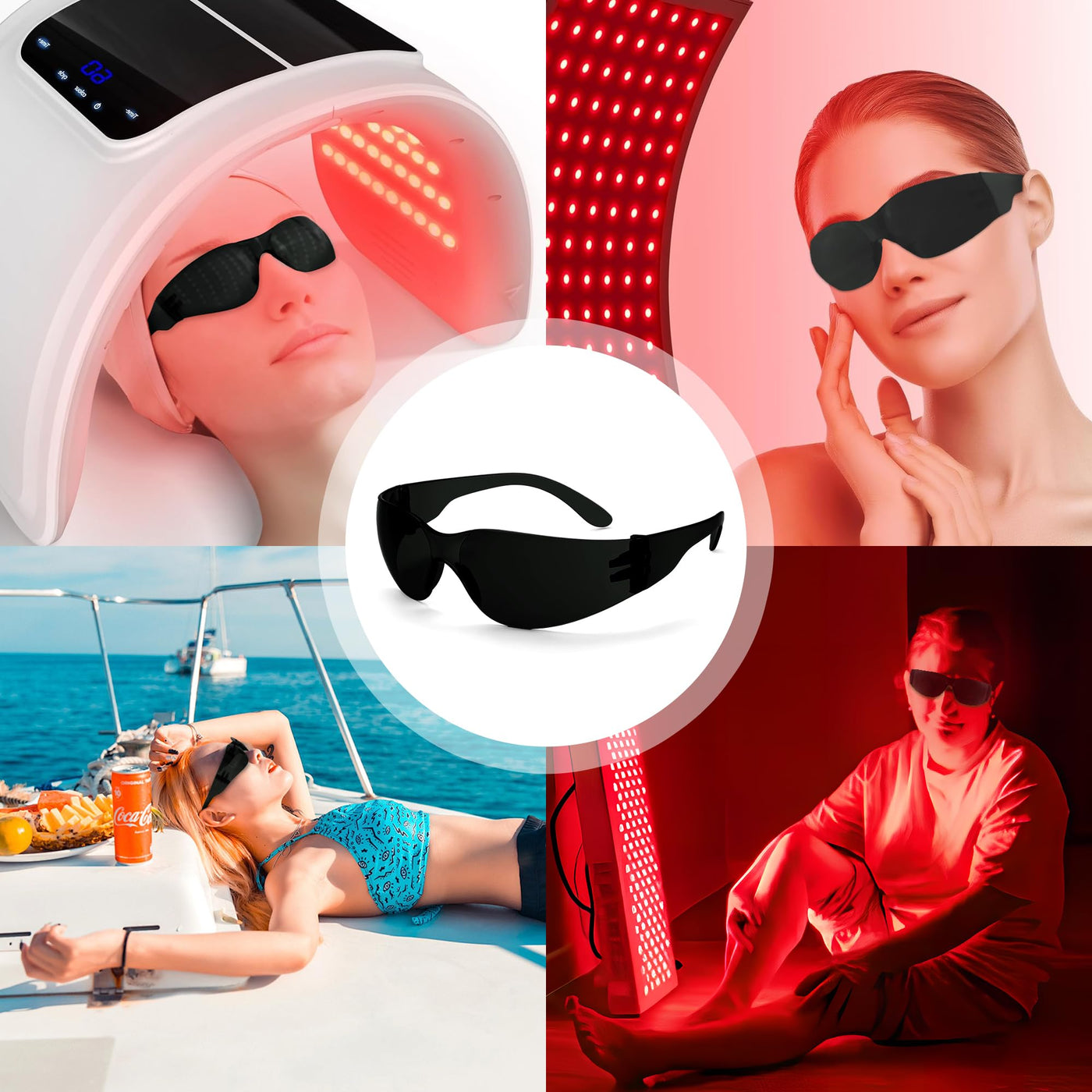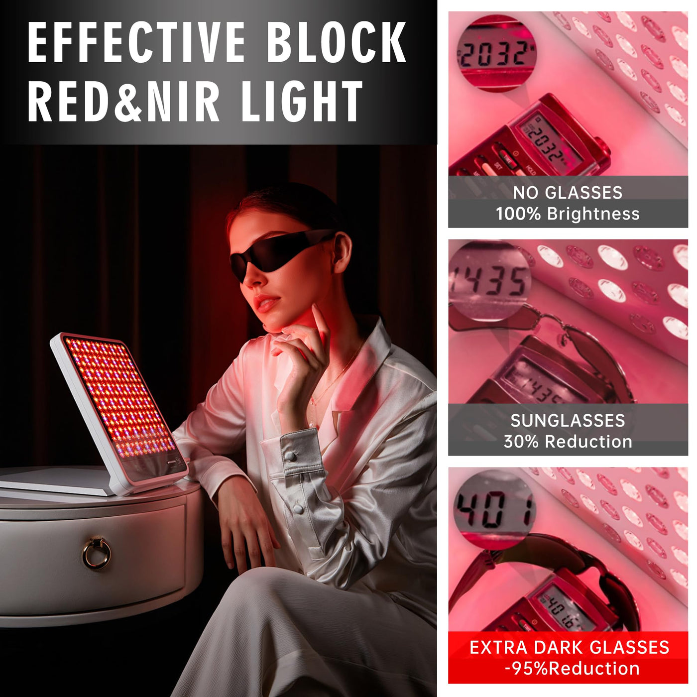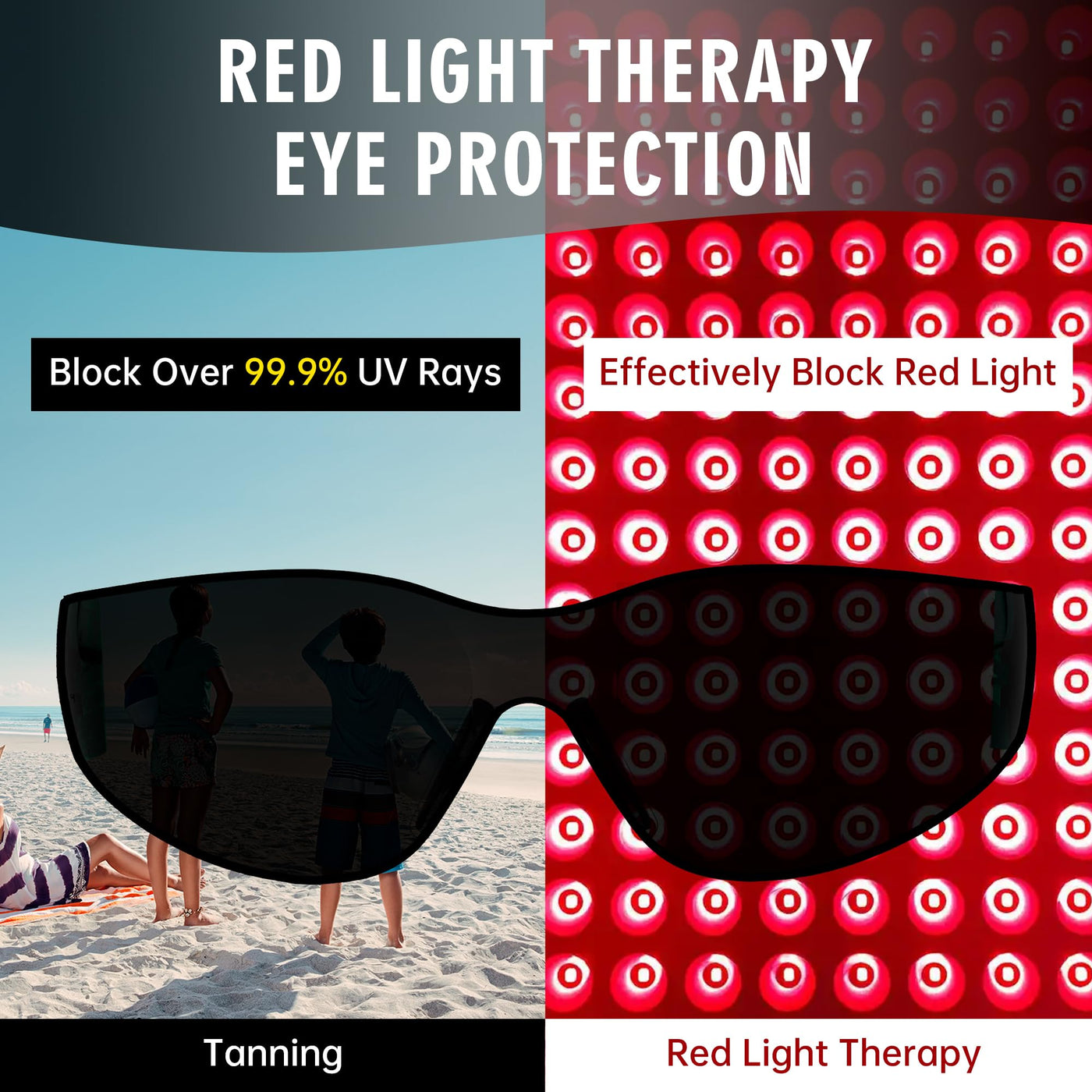 - Eye Protection for Red Light TherapyWhen receiving red light therapy, red light protective glasses can prevent direct red light and infrared from causing damage to the eyes.Stylishly crafted glasses are engineered to shield your eyes from red and near-infrared red light from 600~900nm.Reduces eye strain while still allowing visible light through(95% reduction).