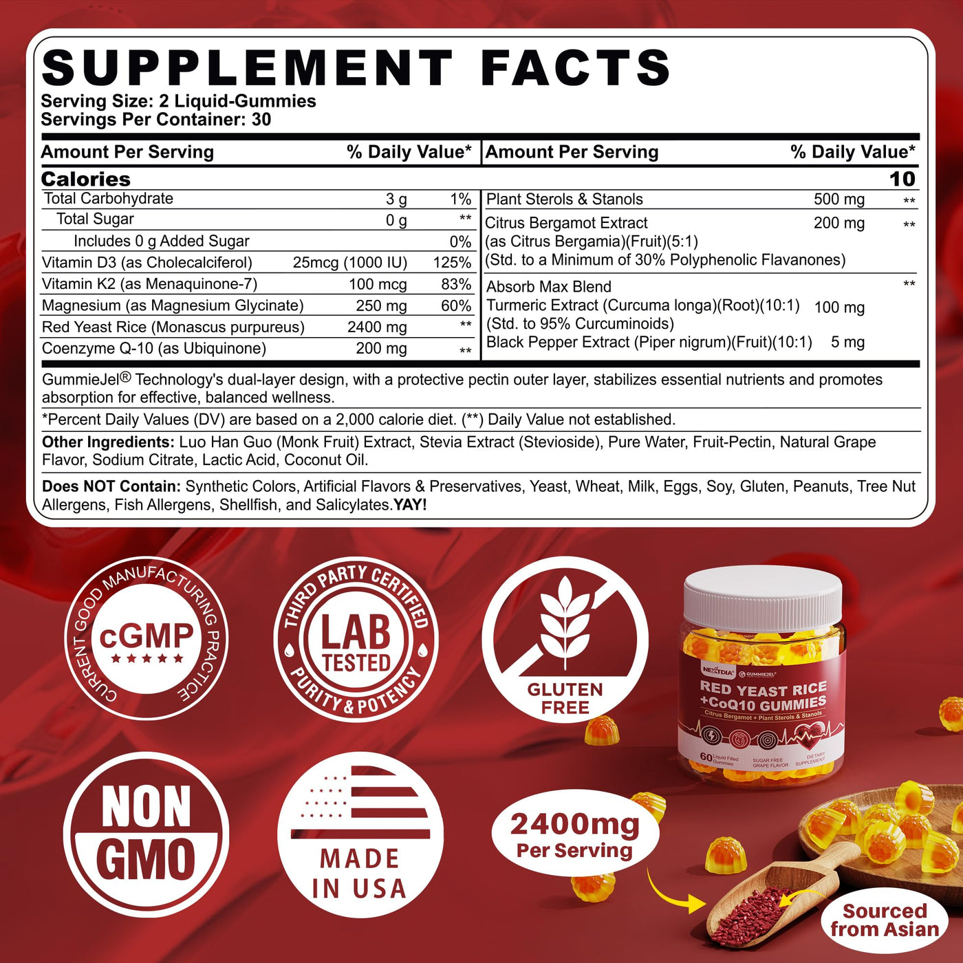 - TRUSTED QUALITY, PURE, GENTLE & HIGHLY EFFECTIVE & GREAT FOR ADULTS: Enjoy delicious red rice yeast for cholesterol liquid filled gummies and energize your body! Our red yeast rice 2400 mg filled gummies are also Non-GMO, natural, free of soy, gelatin & gluten, Vegan & Vegetarian and NO Coloring. 3rd-Party Tested. Long shelf life, no refrigeration requiredperfect for a natural, hart-healthy lifestyle. Have questions? please contact us, and we will promptly resolve them.