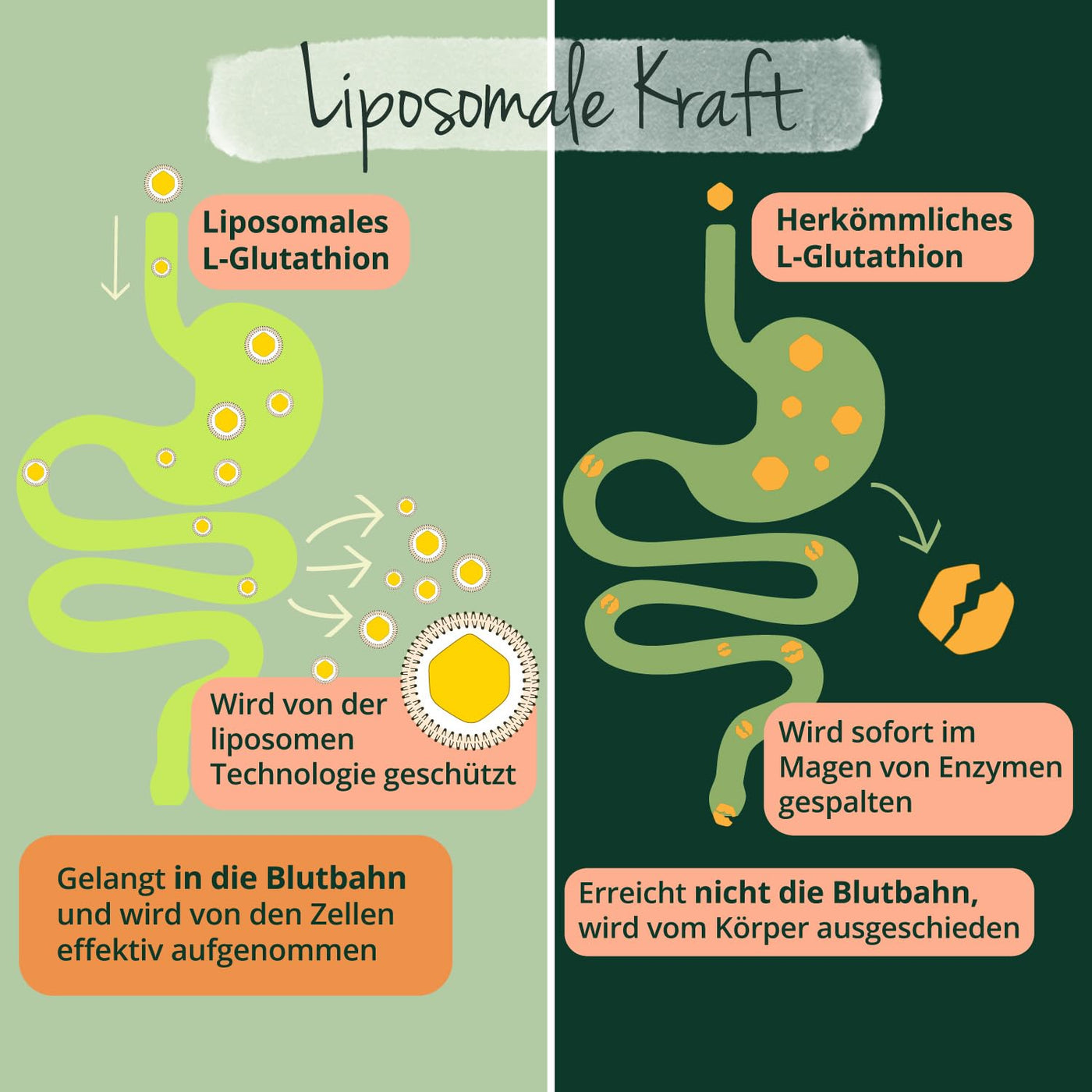 - HIGH BIOAVAILABILITY: The liposomal dosage form is considered the best type of supplementation why? L glutathione and vitamin C are not only protected against heat and stomach acid thanks to liposomal technology. In addition, they are gentle on the stomach and can be effectively absorbed by the intestinal cells due to the lipid coating. We also use reduced L-glutathione, which has the highest bioavailability in liposomal form.
