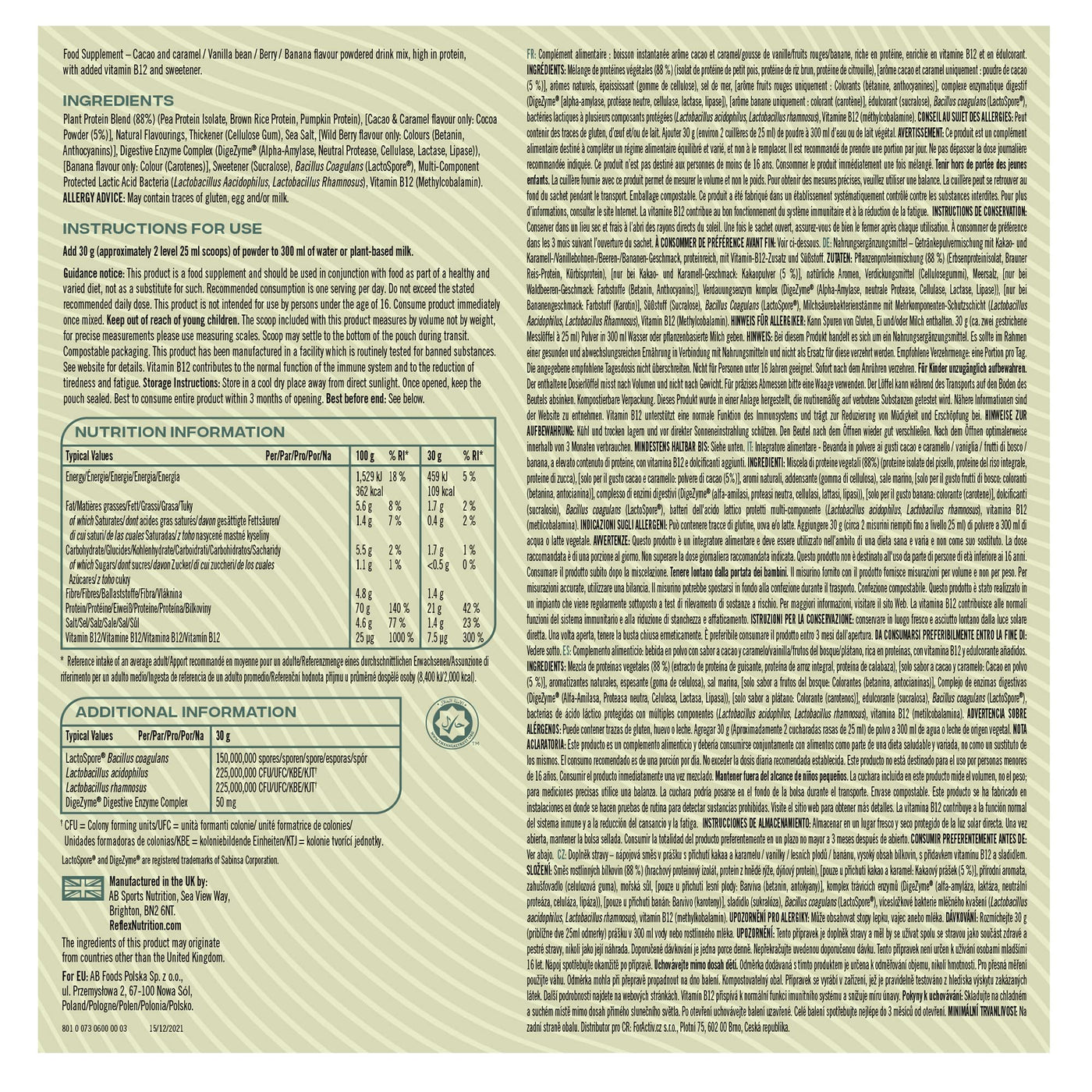 Plant-based vegan protein is our greatest-tasting and highest-quality plant protein to date. Available in three great-tasting flavours: cacao & Caramel, vanilla bean and wild berry. Available in single serve sachets or a 20 serve fully compostable pouch. With each serving containing 21g of protein as well as 300% Recommended intake of Vitamin B12 and added digestive enzymes it is ideal for those with an active lifestyle looking to get additional protein into their diet. Here at reflex we put quality, taste and function at the forefront of every product that we develop and that's why plant-based protein has been designed to offer a complete essential amino acid profile From the most easily absorbable plant protein sources. We've combined pea, brown rice and organic pumpkin seed protein in perfectly balanced qualities to offer maximum absorbability. Plant-based protein is also low in sugar, contains digestive enzymes and LactoSpore, a friendly bacteria. Protein intake is an essential component for muscle growth and amino acids are the building blocks of protein. However, it can be difficult to obtain the correct amount of protein from food, which is where supplements come in. By using a protein supplement after a workout, you can help to ensure that your muscles recover faster. Reflex is always looking for sustainable packaging solutions and ways to reduce our carbon footprint. We searched far and wide to find a compostable pouch, compostable flavour labels and recyclable scoops. Always remember to dispose of your pouch in the compost bin.Address: AB Sports Nutrition Sea View Way, Brighton BN2 6NT, United Kingdom Ingredients Plant Protein Blend (88 Percent) (Pea Protein Isolate, Brown Rice Protein, Pumpkin Protein), [Cacao & Caramel flavour only: Cocoa Powder (5 Percent)], Natural Flavourings, Thickener (Cellulose Gum), Sea Salt, [Wild Berry flavour only: Colours (Betanin, Anthocyanins)], Digestive Enzyme Complex (DigeZyme (Alpha-Amylase, Neutral Protease, Cellulase, Lactase, Lipase)), [Banana flavour only: Colour (Carotenes)], Sweetener (Sucralose), Bacillus Coagulans (LactoSpore), Multi-Component Protected Lactic Acid Bacteria (Lactobacillus Aacidophilus, Lactobacillus Rhamnosus), Vitamin B12 (Methylcobalamin). P.when('A').execute(function(A) { A.on('a:expander:toggle_description:toggle:collapse', function(data) { window.scroll(0, data.expander.$expander[0].offsetTop-100); }); }); Directions Instructions for use: Add 30g (approximately 2 level 25ml scoops) of powder to 300ml of water or plant-based milk Manufacturer Contact Information Reflex Nutrition, Sea View Way, Brighton, BN2 6NT, UK See more