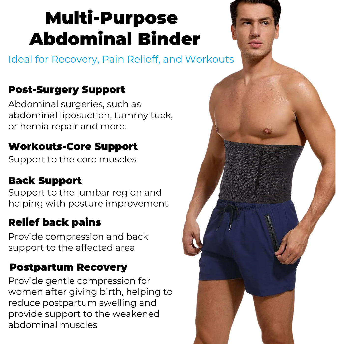 - Speed Up Your Recovery: Our abdominal binder encourages deep breathing and better posture, helping your body recover more efficiently. This means you can return to your regular activities faster, making it an essential accessory for men recuperating from abdominal surgery