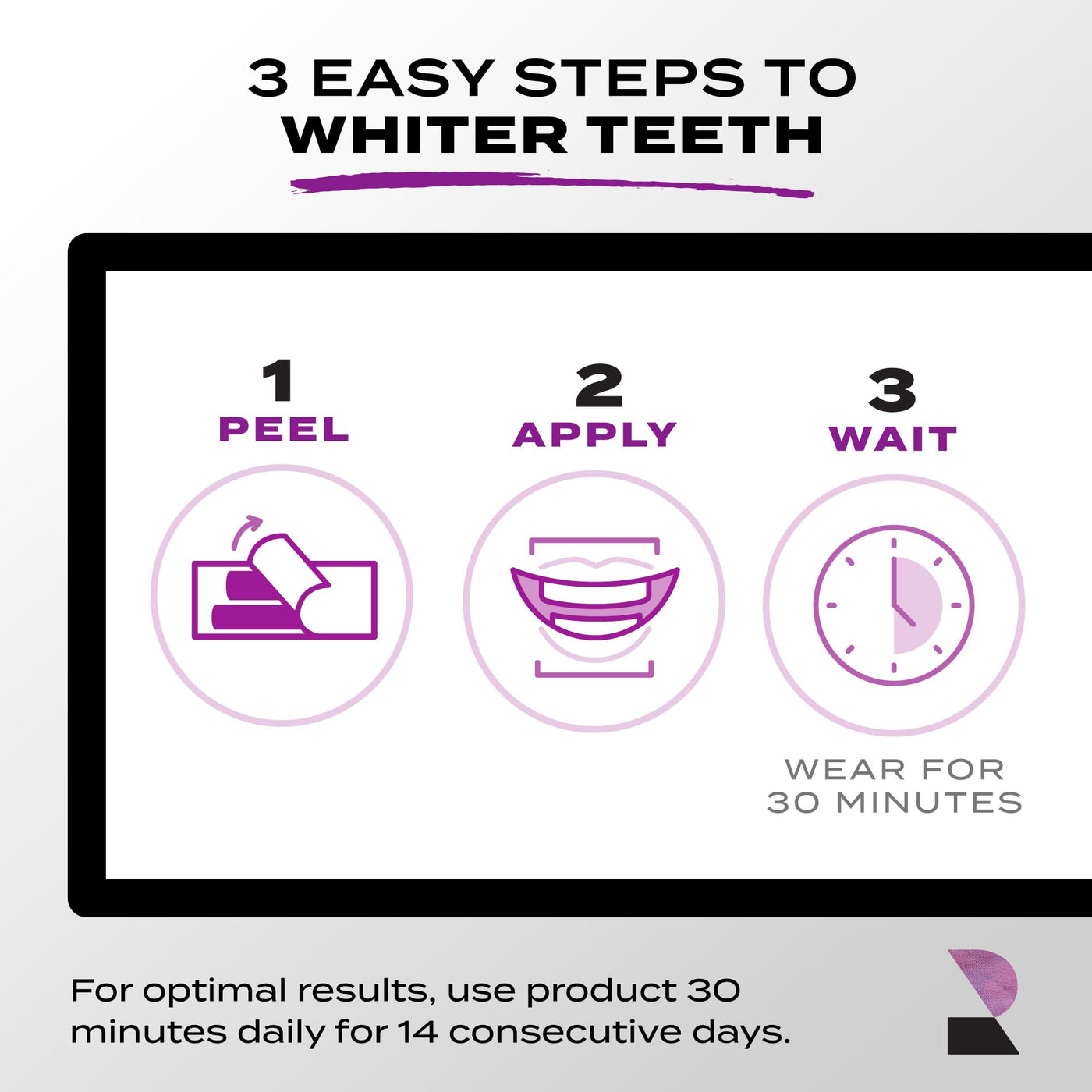 - 3 Easy Steps to Whiten Your Unique Smile: 1. Peel. 2. Apply. 3. Wait (wear for 30 minutes).