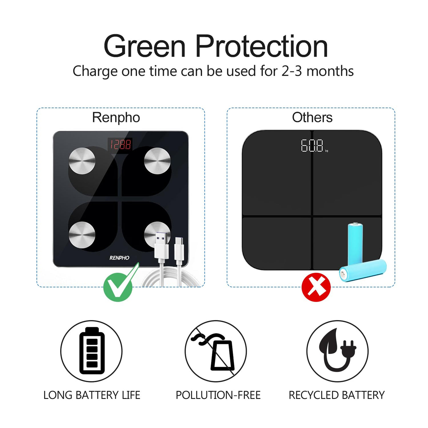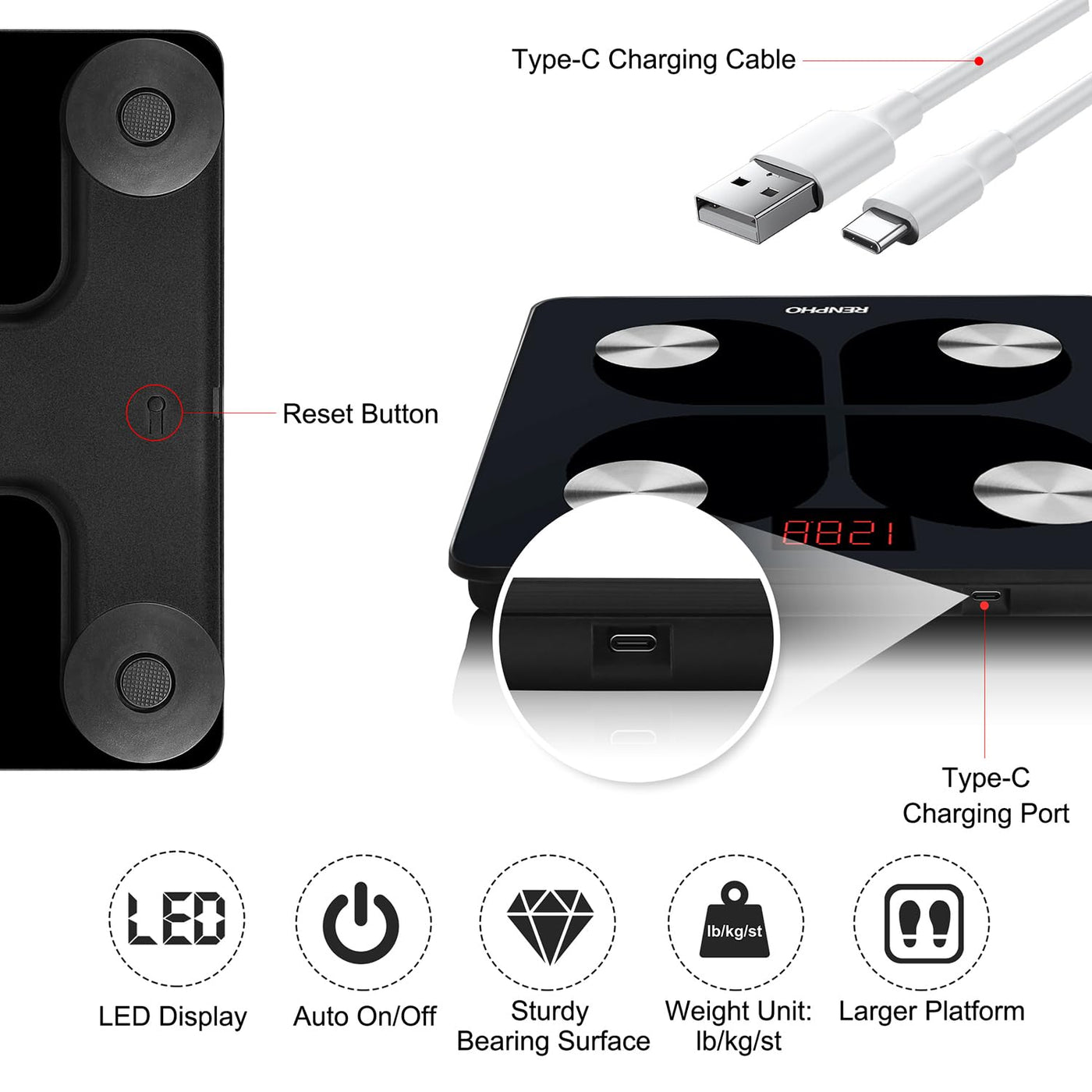- Environmentally friendly battery operation - With a built-in lithium battery, the scale can be conveniently charged using a USB cable. If the scale cannot be turned on after charging, please press the reset button on the back.