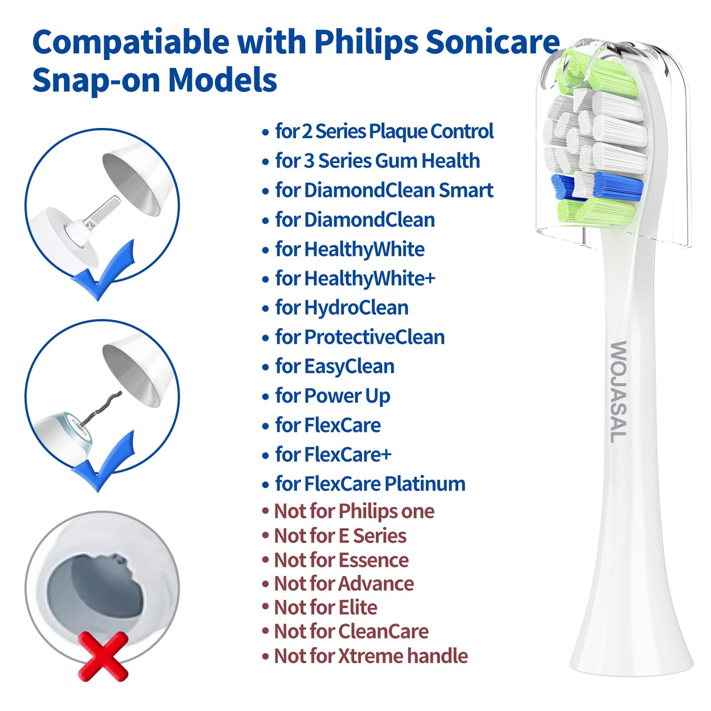 - High Compatibility: WOJASAL electric replacement heads are compatible with Philips Sonicare click-on toothbrush handles, for 2 Series Plaque Control, for 3 Series Gum Health, for EasyClean, for FlexCare, for HealthyWhite, for HydroClean, for ProtectiveClean, for Prestige, for ExpertClean