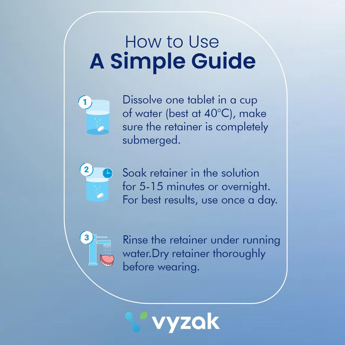 - WORKS FAST - Dissolve a tablet in 1 cup of warm water. Place your dental appliance in the warm water and allow to soak for 5 to 15 minutes. Leave overnight for stuck on stains and buildup. When done, rinse dental appliance with running water and dispose of remaining dissolved tablet water solution.