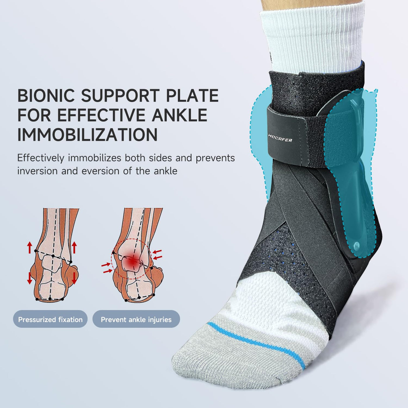- RELIEVE YOUR PAIN: HOCAFER ankle brace with reinforced side stabilizer and curved arch design can quickly reduce the pain and pressure of the ankle. Ankle support brace can also help joint pain, minor sprain pain relief, and injury recovery