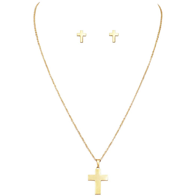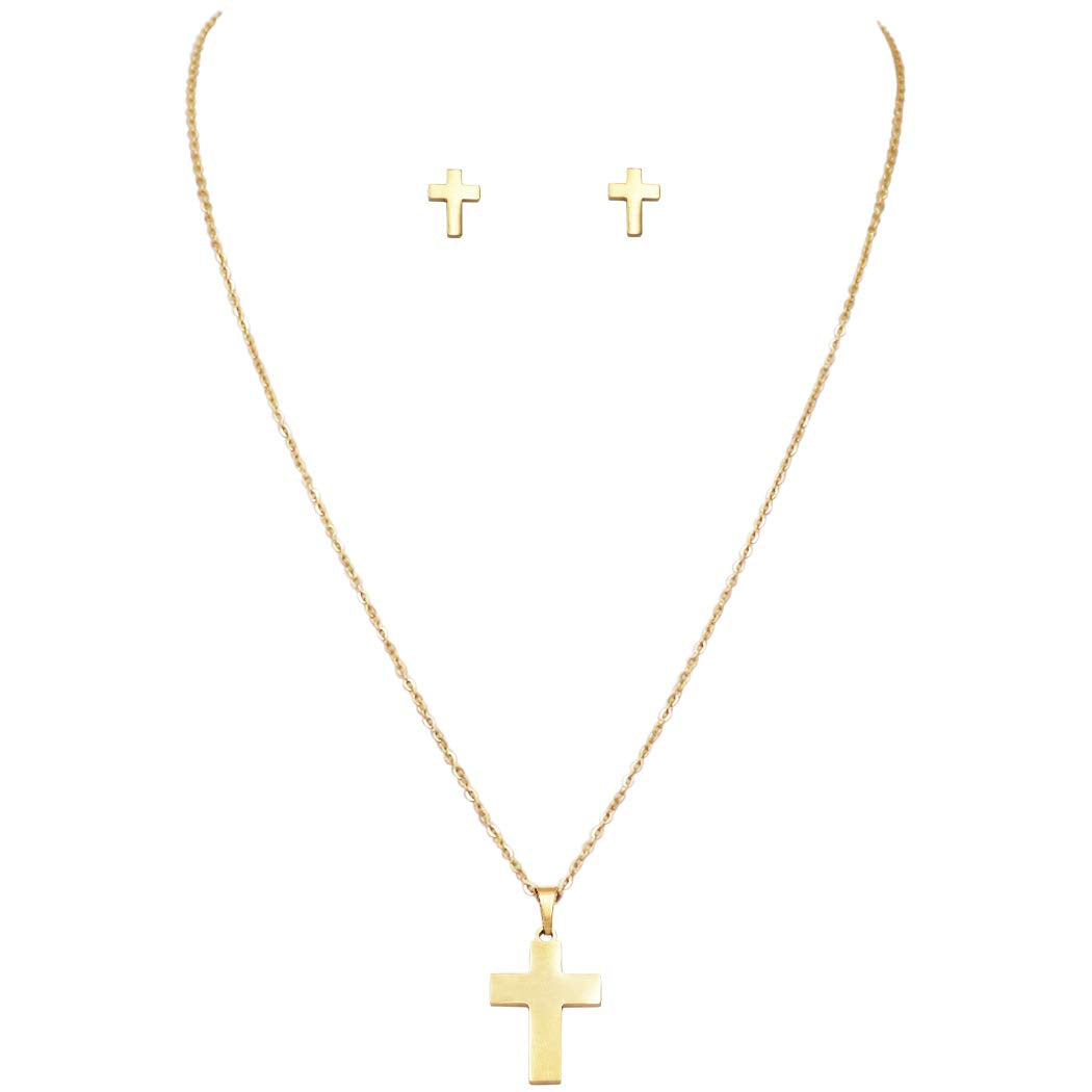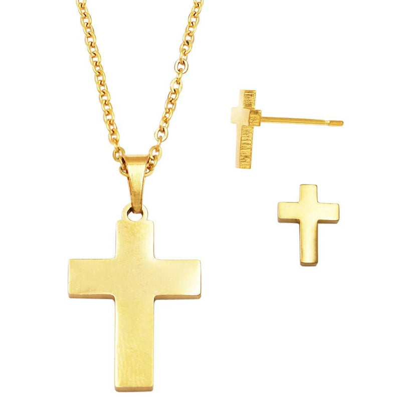 Rosemarie & Jubalee Women's Stainless Steel Cross Charm Necklace and Earrings Set Large Gold Tone