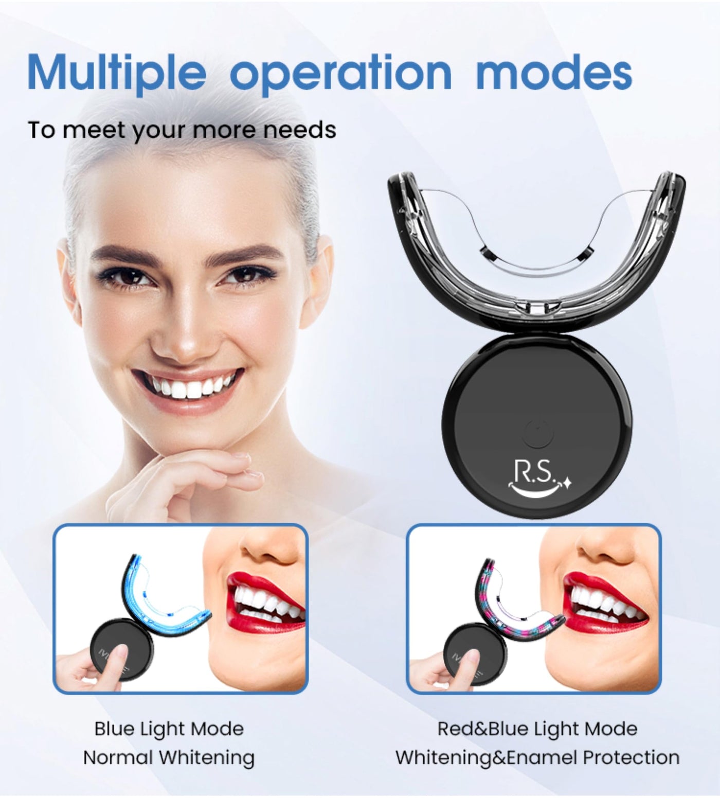 - 32 Dual LED Lights: The RS Smile Teeth Whitening Kit is equipped with advanced red and blue light technology that works in synergy for optimal results. The red light helps soothe and protect your gums, while the blue light deeply penetrates tooth enamel, effectively removing stains caused by coffee, tea, wine, and other substances. This technology provides a comprehensive approach to whitening, leaving your smile brighter and healthier.