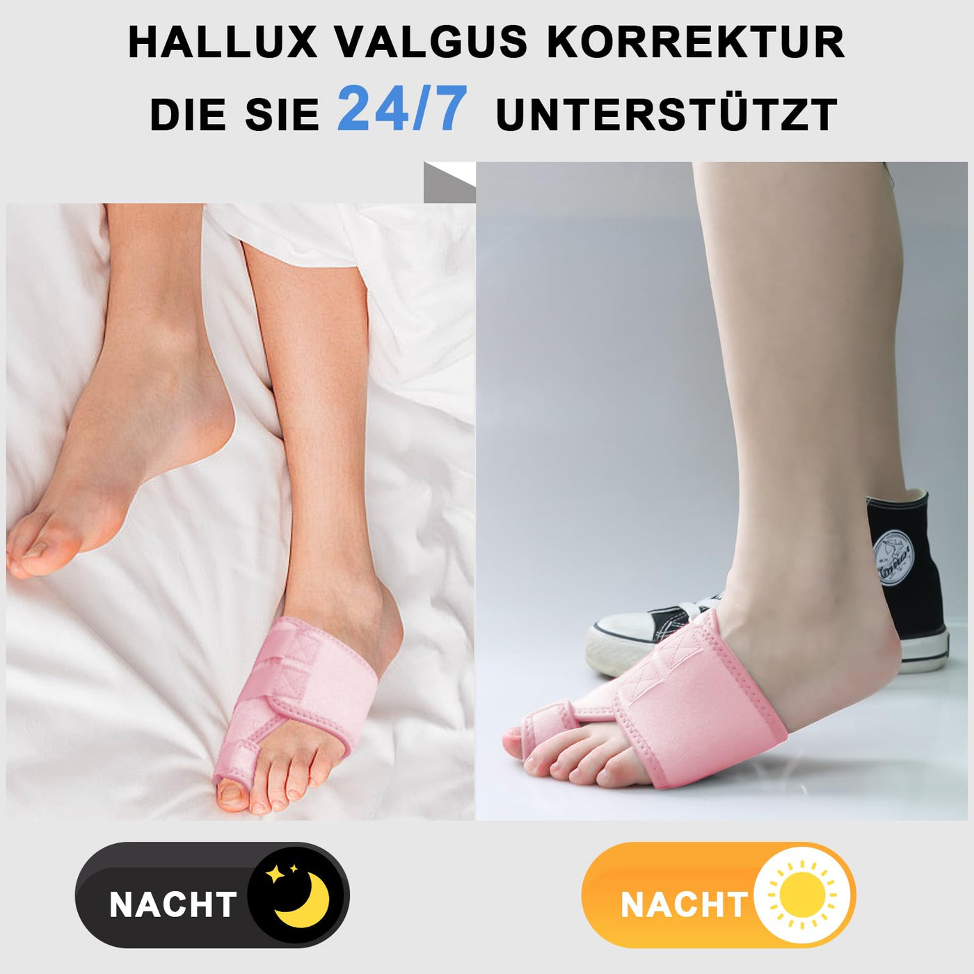 - Day and night support: Our hallux splint can be used 24/7 to continuously support your toes, relieve pain and correct big toes.
