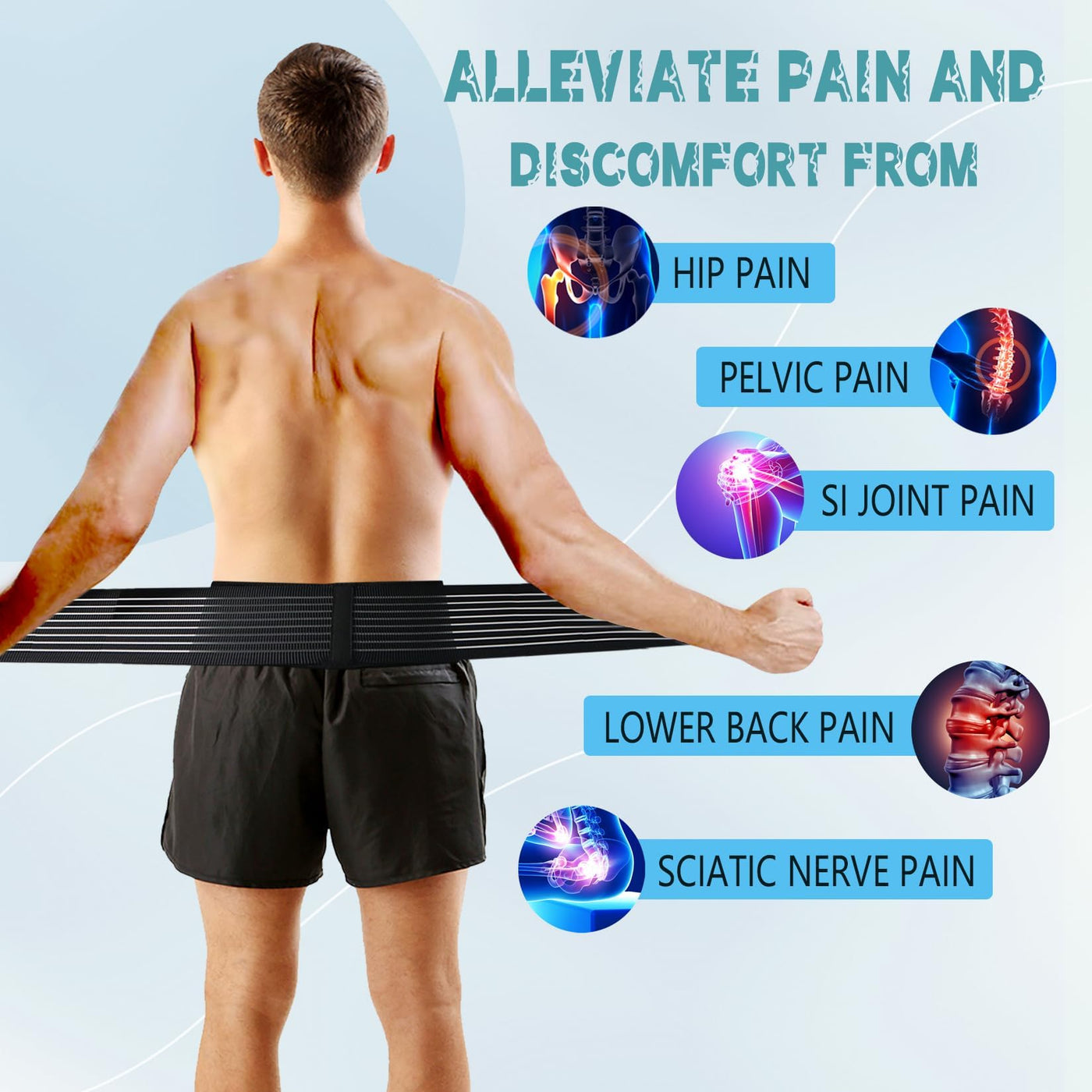 - RELIEVES SCIATICA AND LOWER BACK PAIN - The adjustable hip SI brace will help support your lower spine and hips to relieve pain, pressure and stress caused by pelvic instability or SI joint dysfunction. The medical grade belt is designed to effectively stabilize and support your pelvis and hips. Simply the best solution for: back pain, hip pain, pelvic pain, upper leg pain, symphysis pubis dysfunction, pelvic girdle pain, piriformis syndrome or anterior pelvic tilt.