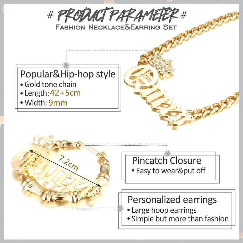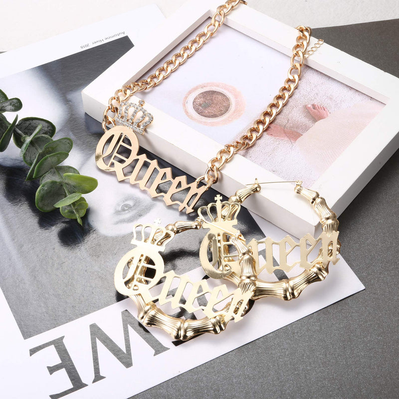 - Hip Hop Punk Style: Compared To Other Fashionable Ladies' Jewelry, This Hip-Hop Punk-Style Necklace And Earring Set Highlights a Unique Female Personality. Large Bamboo Circle Hoop Earrings, Thick Curb Chain Queen Pendant, All Of These Represent Free-Spirited Personality.