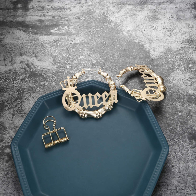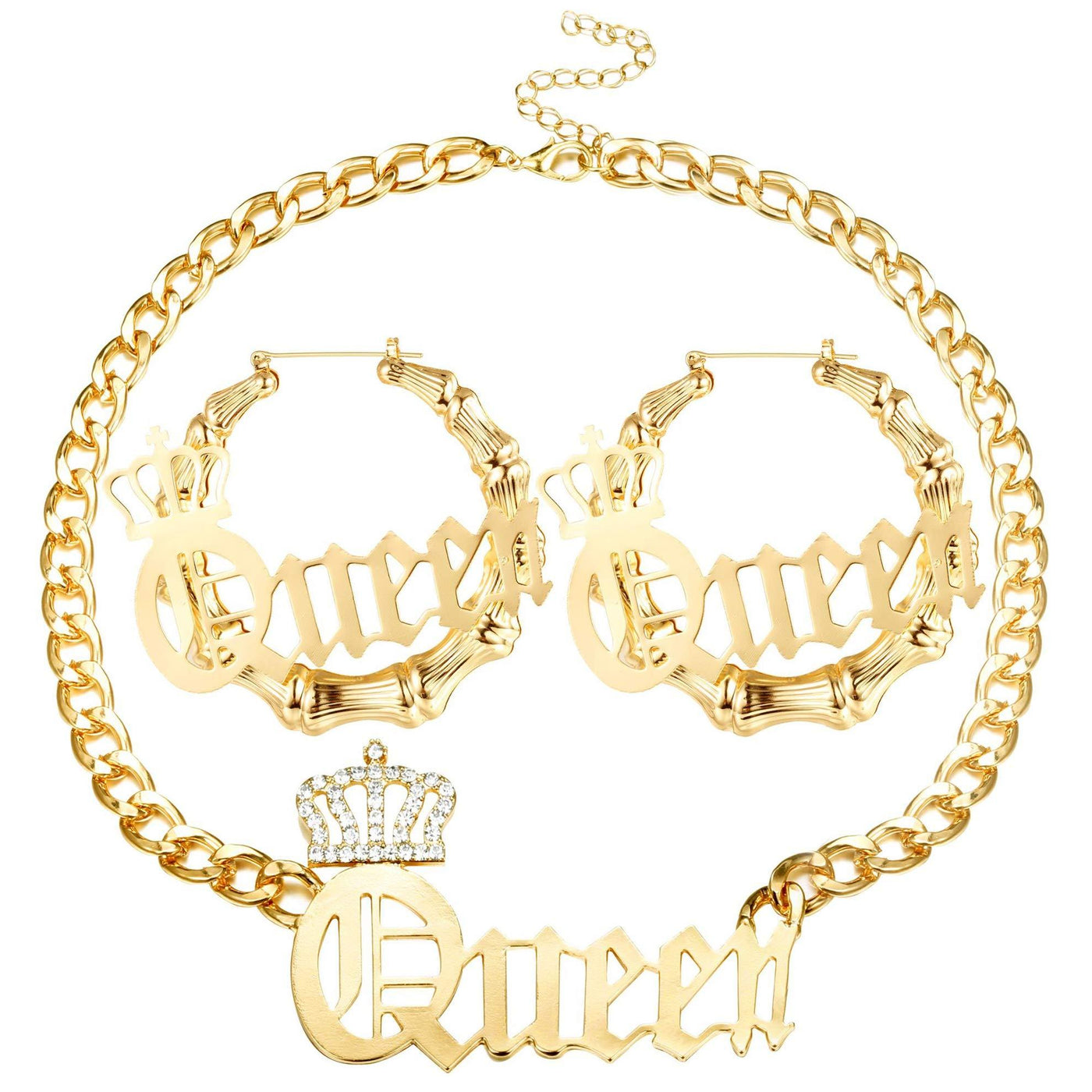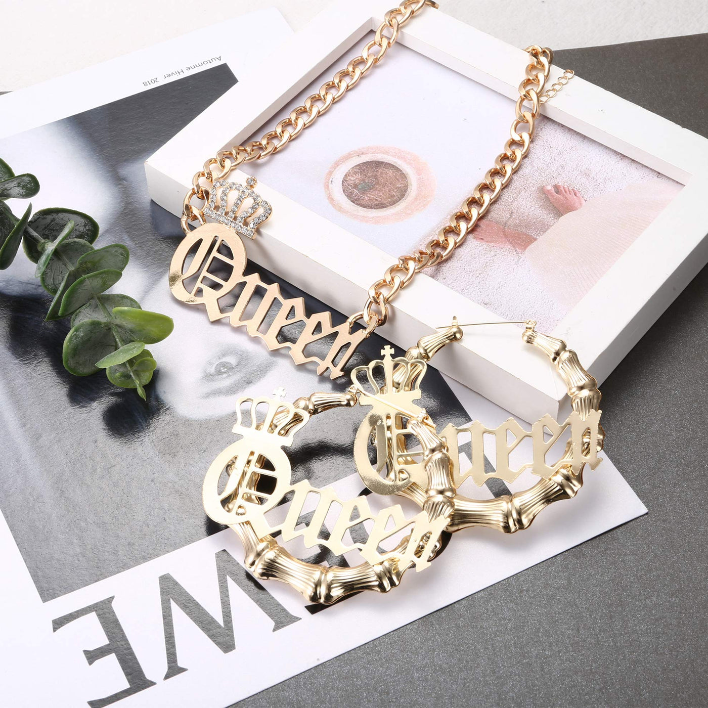 sailimue Queen Pendant Curb Chain Necklace with Oversize Statement Bamboo Hoop Earring Set for Women Gold Plated Color Punk Style Hip Hop Rapper B:Bamboo earrings+Queen Necklace
