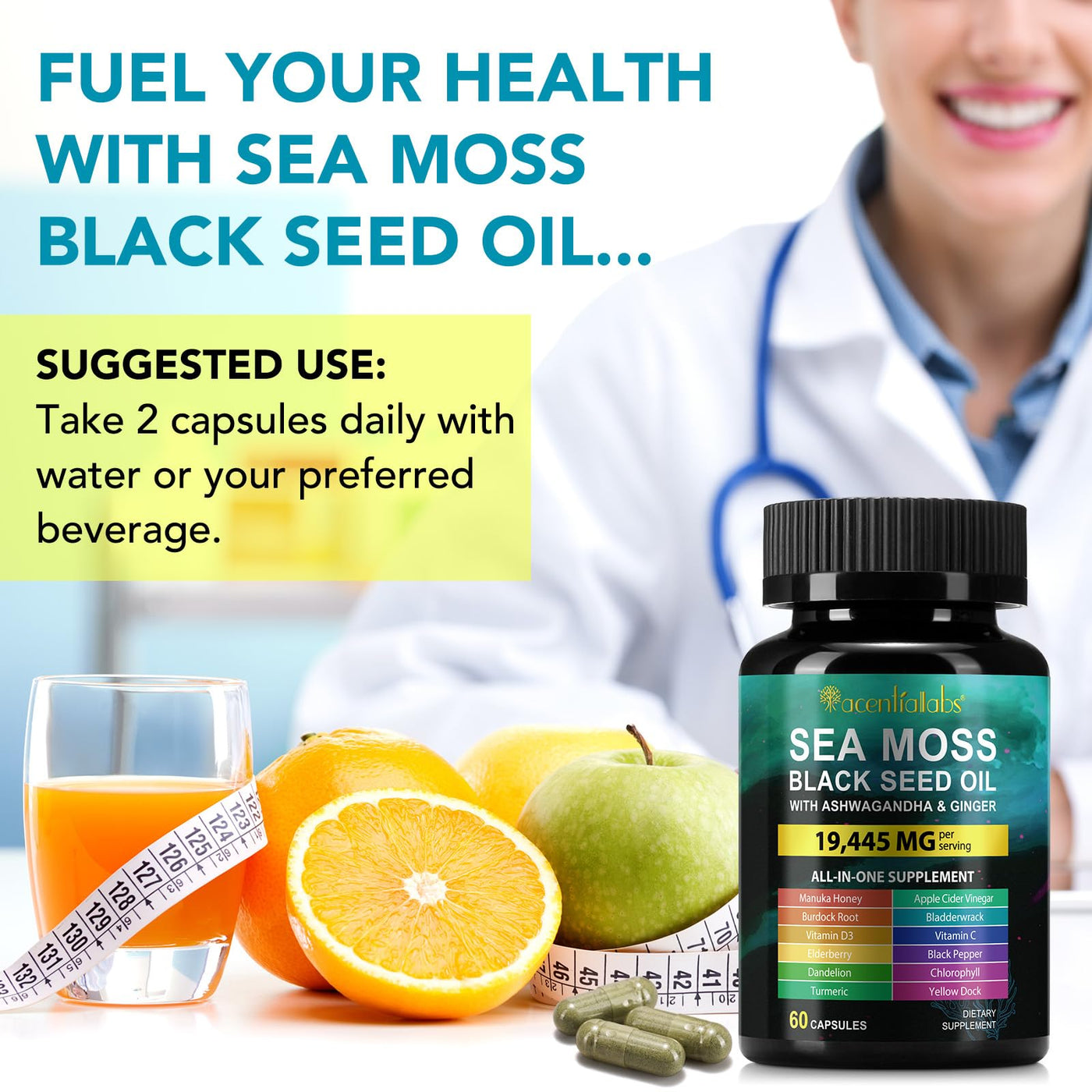 - Full effect nutritional supplement: Rich in seaweed, black seed oil, South African eggplant, ginger, burdock root, apple cider vinegar mixture vinegar, turmeric, etc., each serving contains up to 19445 milligrams of these powerful ingredients