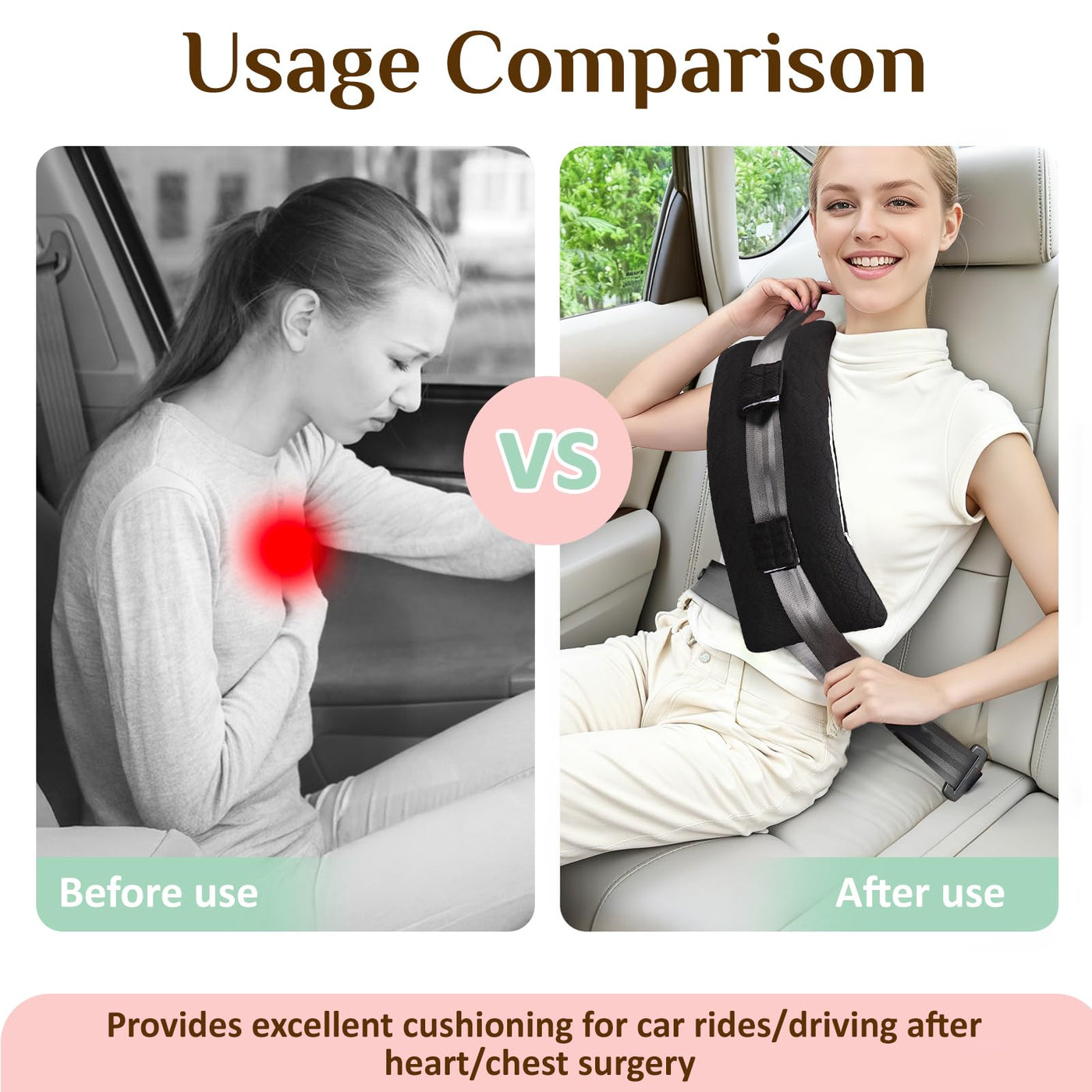 - Drive with Confidence After Your Procedure - Our mastectomy seatbelt pillow provides gentle cushioning and shock absorption during car rides. It helps prevent the seatbelt from digging in and avoids rubbing against sensitive areas, allowing you to fasten your seatbelt with greater peace of mind