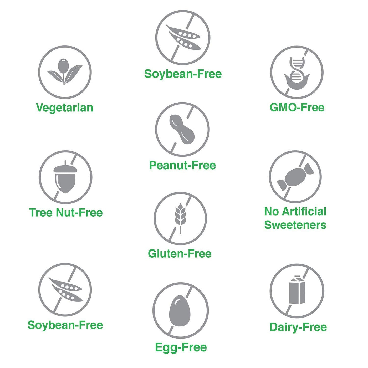 - Free from: Eggs, fish, gluten, GMO, milk, peanuts, shellfish, soy, tree nuts, wheat, corn, artificial colors, artificial flavors, and artificial preservatives