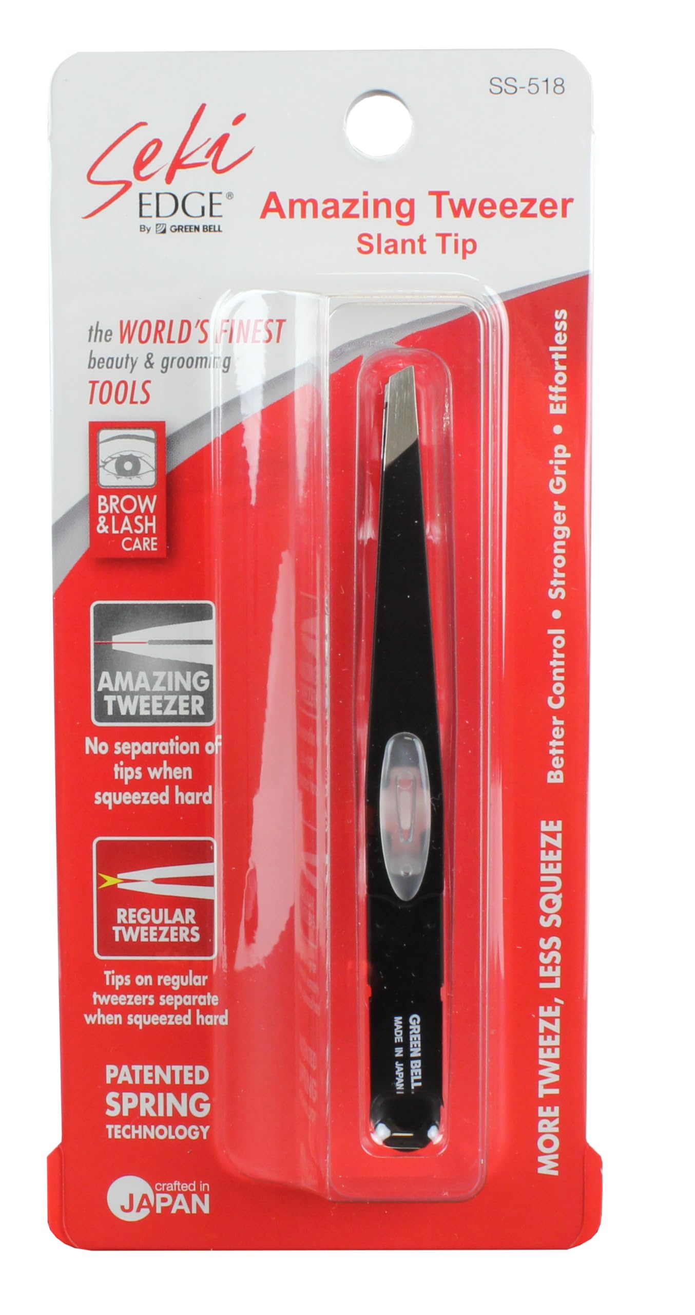 ‘SPRING’ TECHNOLOGY IN A SINGLE SQUEEZE! Revolutionary Seki ‘Spring’ technology transfers strength from the hands to the tip of this slanted tweezer with a gentle squeeze. With tweezer handles twice as thick as traditional tweezers, the beauty in this innovative design is that the lightweight handles will not bend to pressure. It’s beautiful brow shaping with no hand fatigue. The tips are designed to always come together flat creating maximum efficiency, precise and accurate tweezing. Individual hair is easily pulled with a single squeeze. The Amazing Tweezer is made of stainless steel and features a tension stopper to keep tips from wiggling when tweezing. Made in Japan.