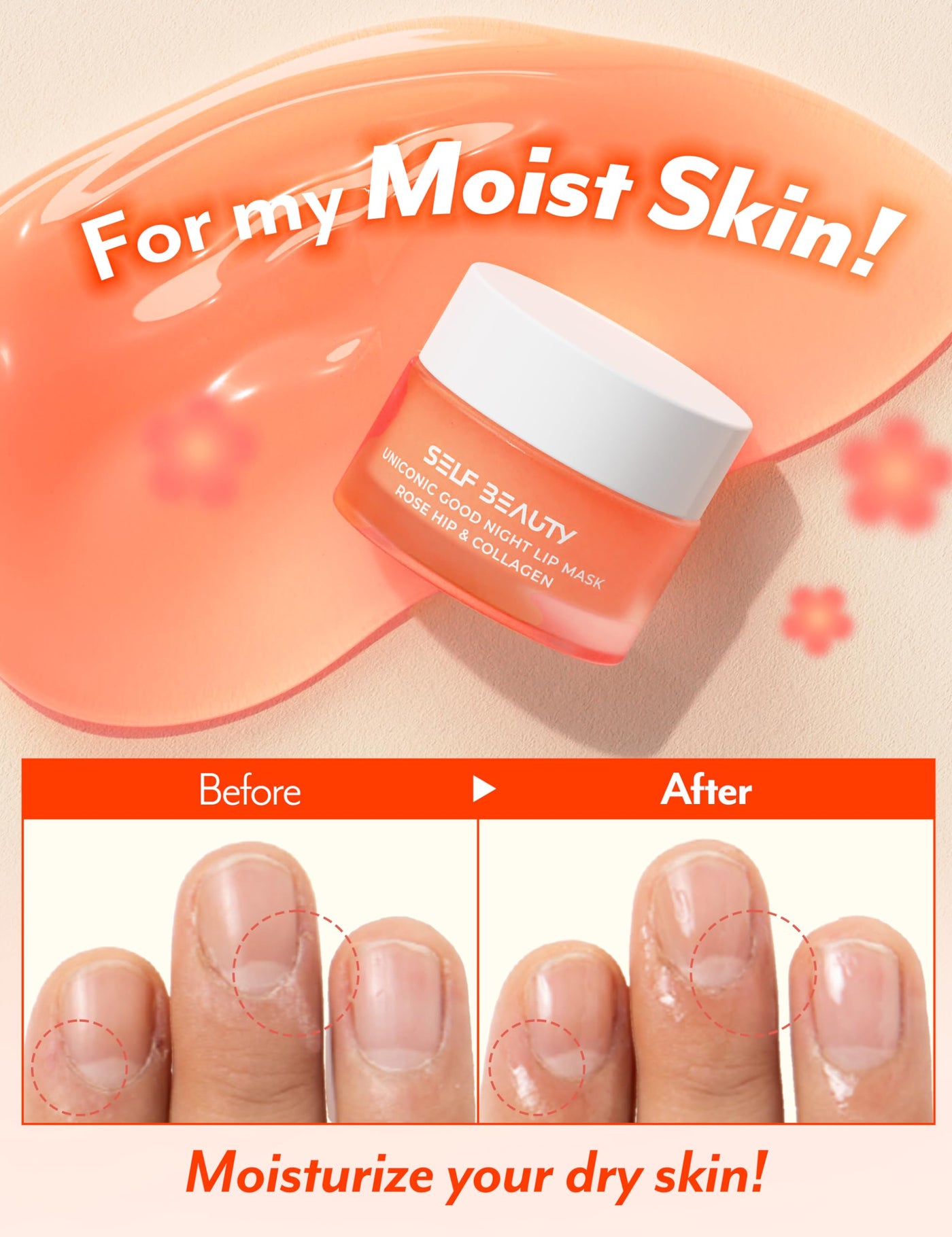- MOISTURIZE YOUR LIPS. Our hydrating lip mask offers instant moisture and smoothens the texture of your lips overnight. Essential fatty acids and collagen peptides in the Rose hip ingredient are absorbed to deliver rich moisture and nutrients to your dry and cracked lips.