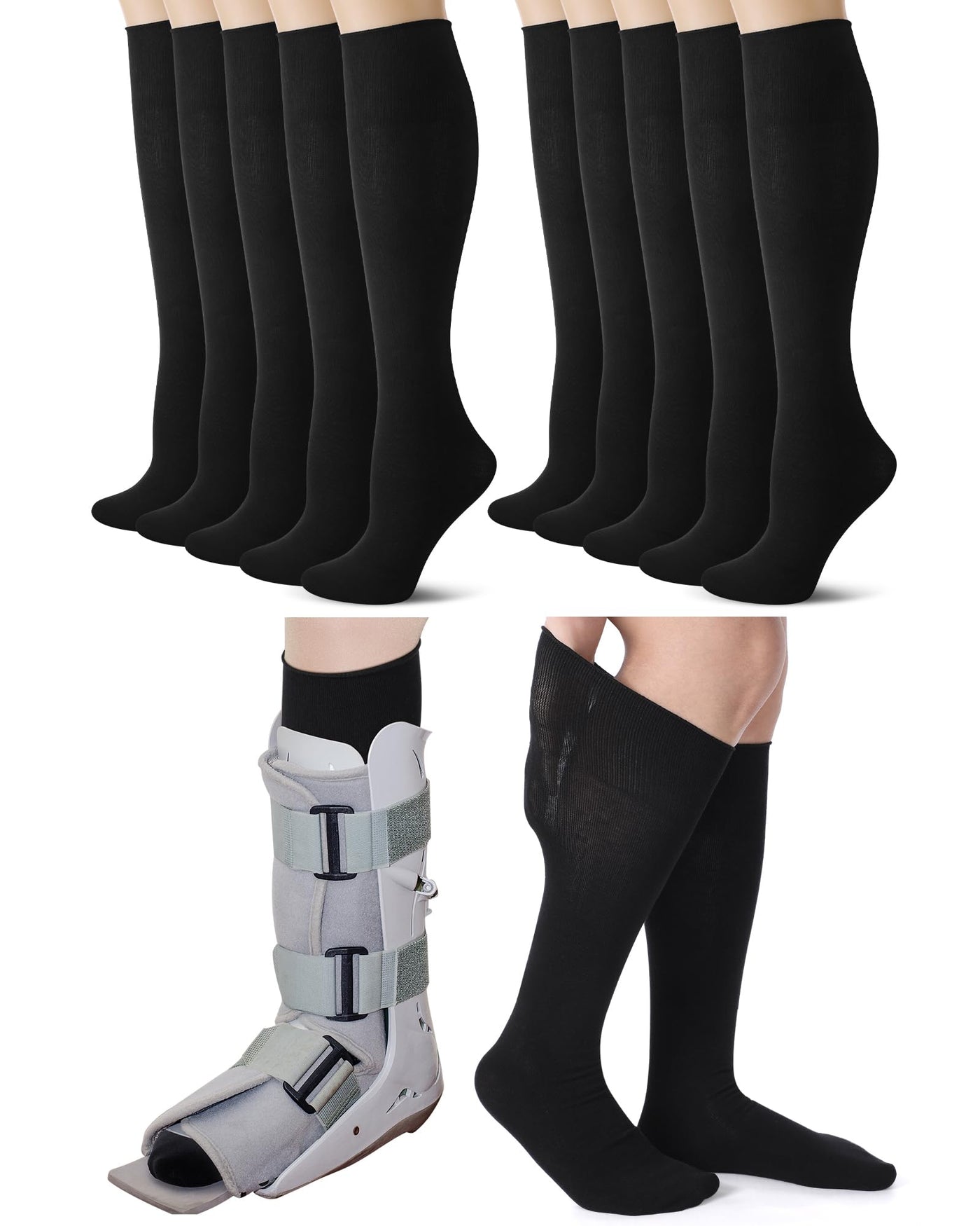 Shihanee 5 Pairs Seamless Walking Boot Socks Over The Calf Loose Fit AFO Tube Socks Liner for Cam Walker Orthopedic Boot Cast Black