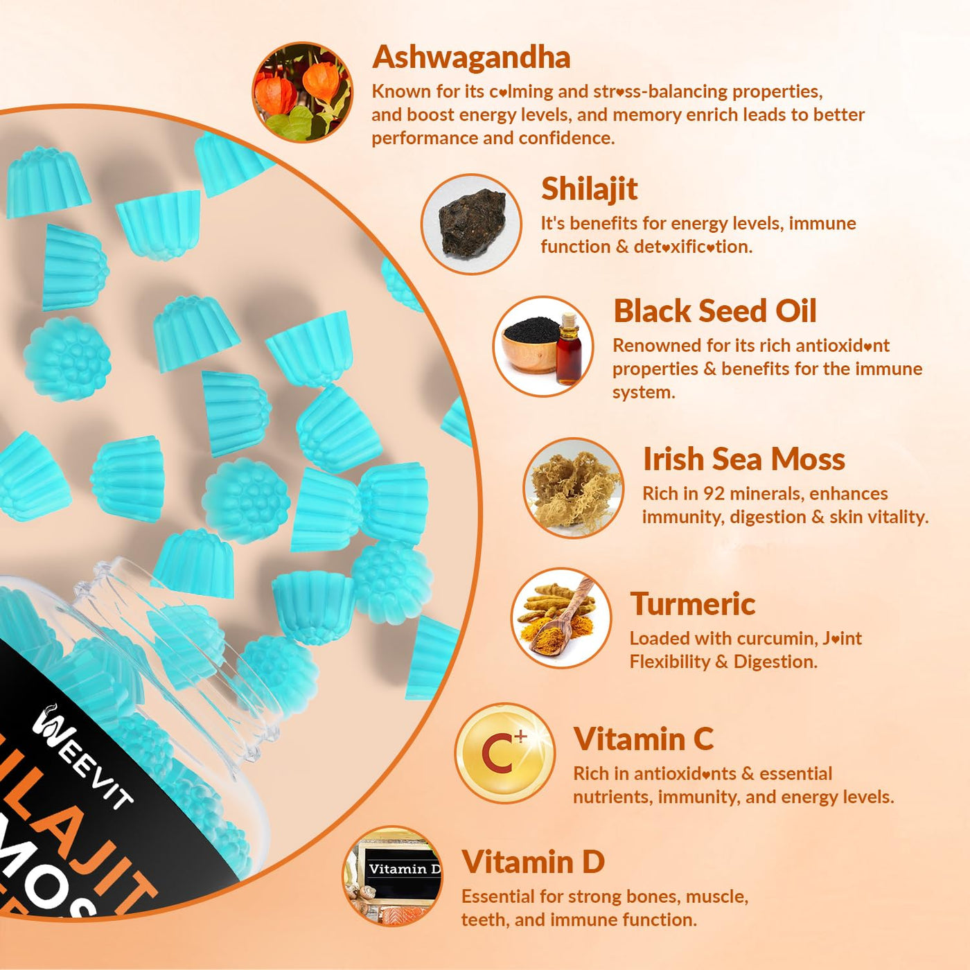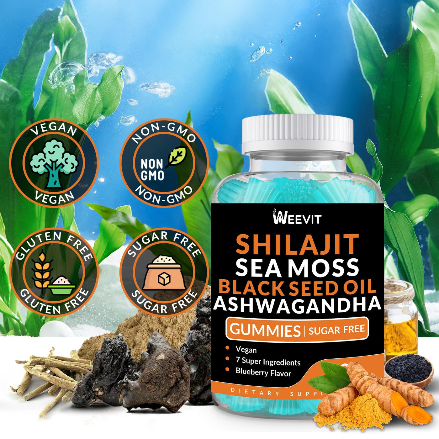 - SUGAR-FREE & VEGAN: Our shilajit sea moss black seed oil ashwagandha gummies are Non-GMO, gluten-free, soy-free, vegan, and free from artificial colors and flavors.