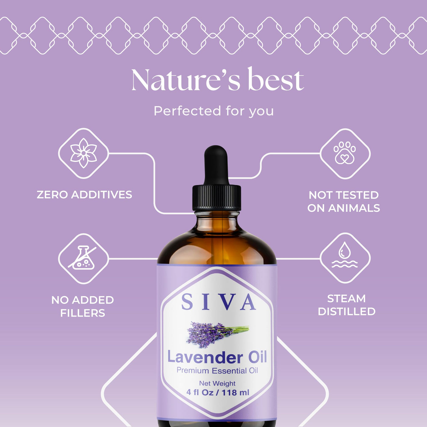 - PREMIUM QUALITY LAVENDER ESSENTIAL OIL: SIVA Lavender Oil 4oz is an essential oil and is obtained by steam distillation of Lavandula Angustifolia flowers. Our Lavender essential oil is free of preservatives and comes with a dropper for easy application. It is not tested on Animals. We care for you!