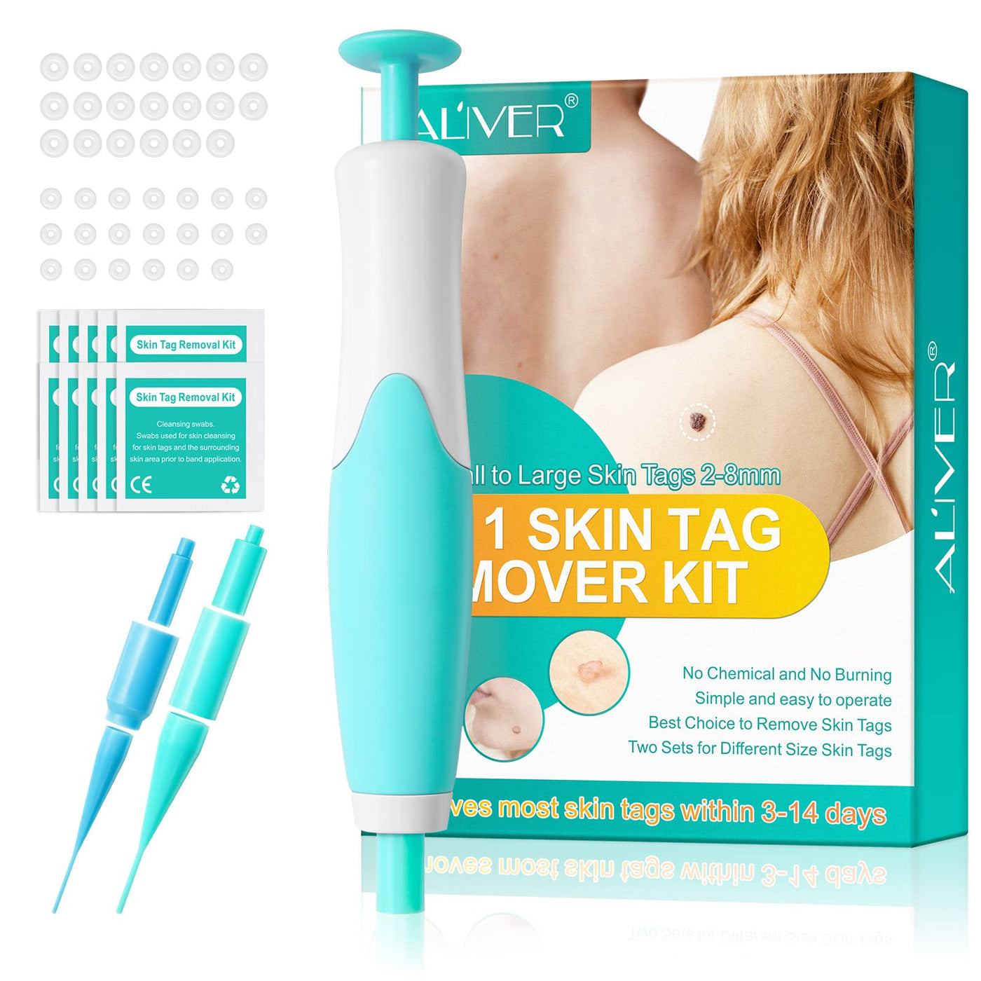 - 2-in-1 Skin Tag Removal: Skin Tag Remover kit has 2 heads that double the effectiveness of the treatment. Skin Tag Removal Patch Safe and Painless, 2-8mm bands, 4-8mm head for larger skin tags, and the 2-4mm head for smaller ones. Includes 1 x label remover, 20 x large tag bands, 20 x small tag bands, 10 x alcohol wipes