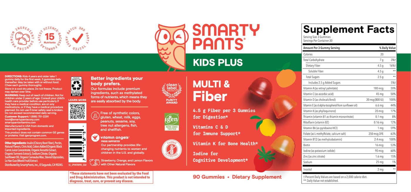 New and improved SmartyPants Kids Plus Multi & Fiber is a multifunctional gummy multivitamin and digestive fiber supplement formulated with nutrients parents want in a delicious format that kids love! Each serving delivers 15 daily nutrients including prebiotic fiber for digestion, vitamins D3 for bone health, C for immune support, B12 to support energy metabolism, folate in the premium form, methylfolate, and the antioxidant, vitamin E, all in one delicious three-gummy serving. SmartyPants formulas include nutrient forms that your child's body can easily use, like D3 and folate as methylfolate, to help fill nutrient gaps and support overall growth and development. Our formulas are non-GMO, third party lab tested for purity and potency, made without any synthetic colors or artificial sweeteners. Serving size is 3 gummies per serving.