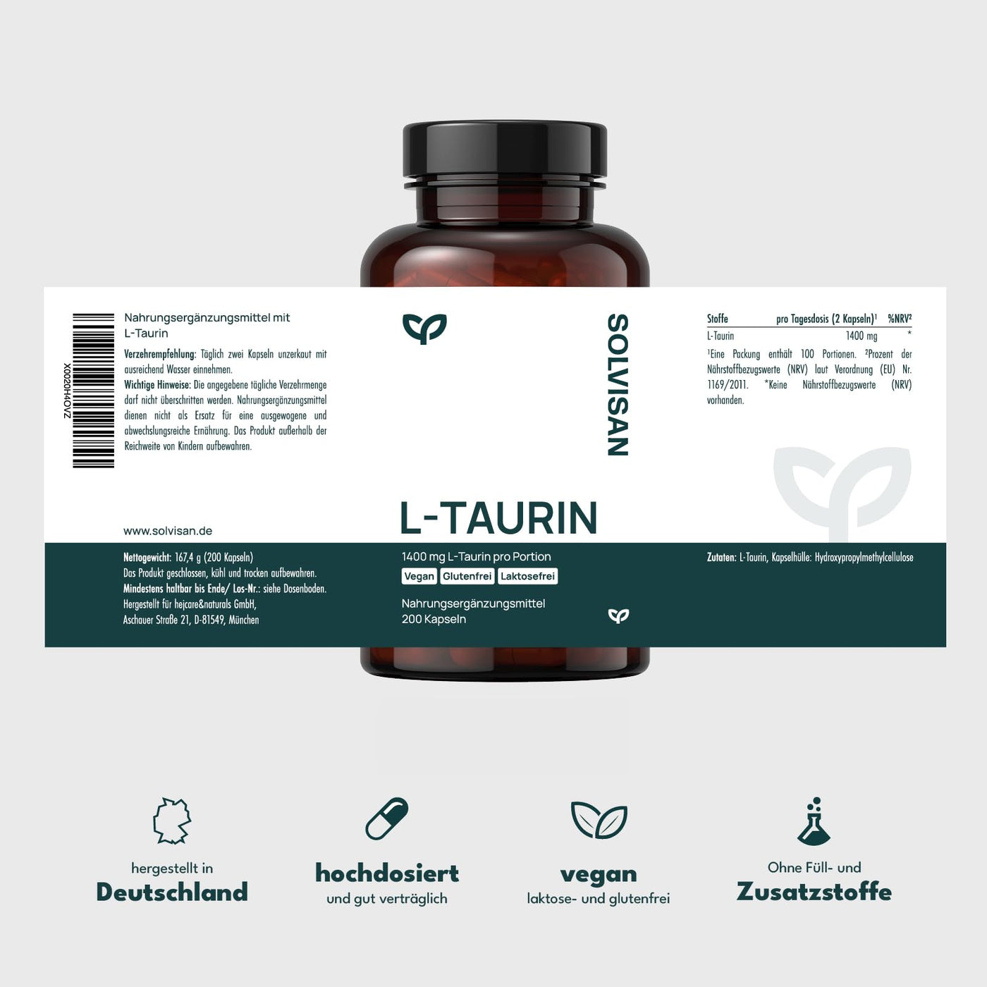 SOLVISAN L-Taurine capsules high dose with 1400 mg per day - 200 capsules - Pre Workout - Without additives