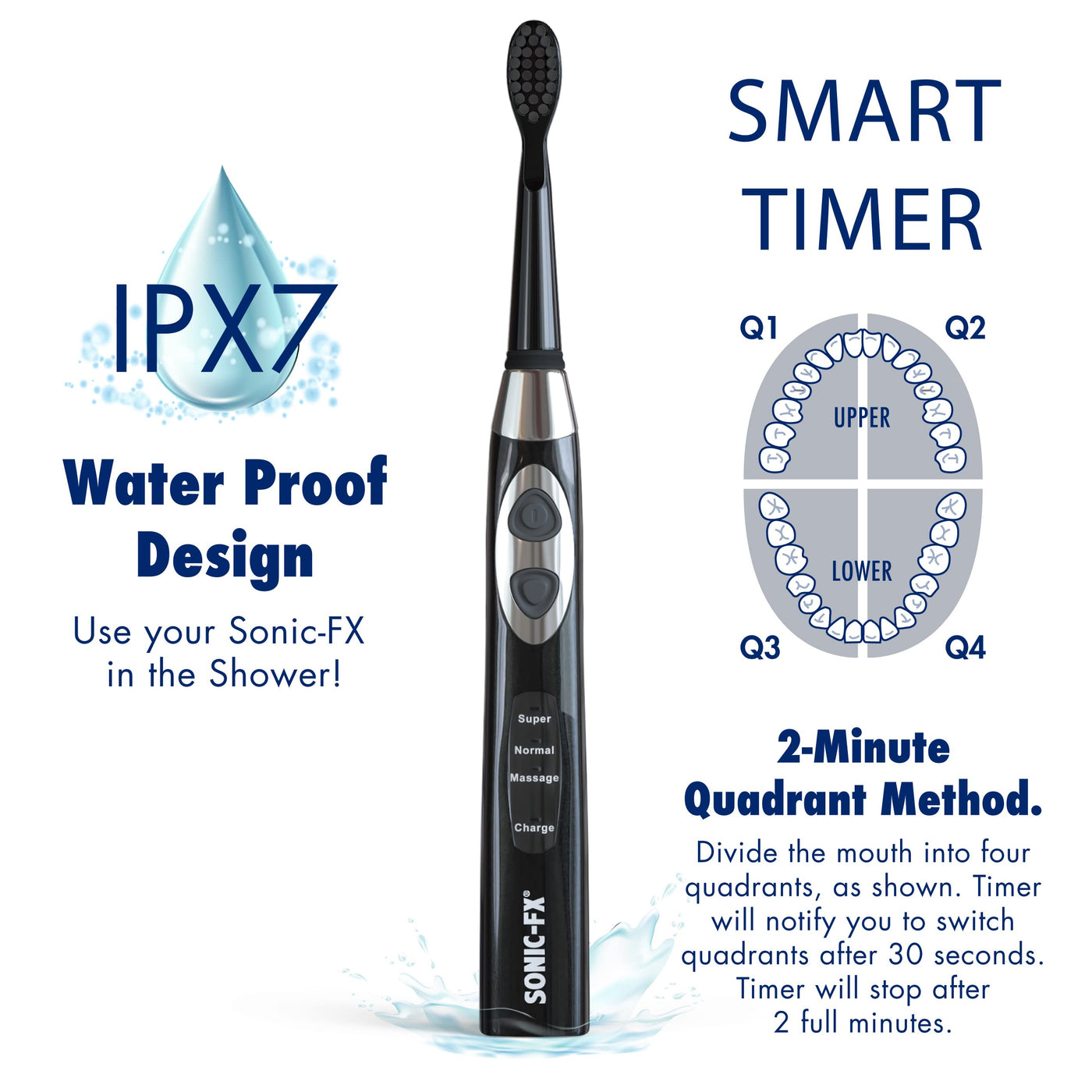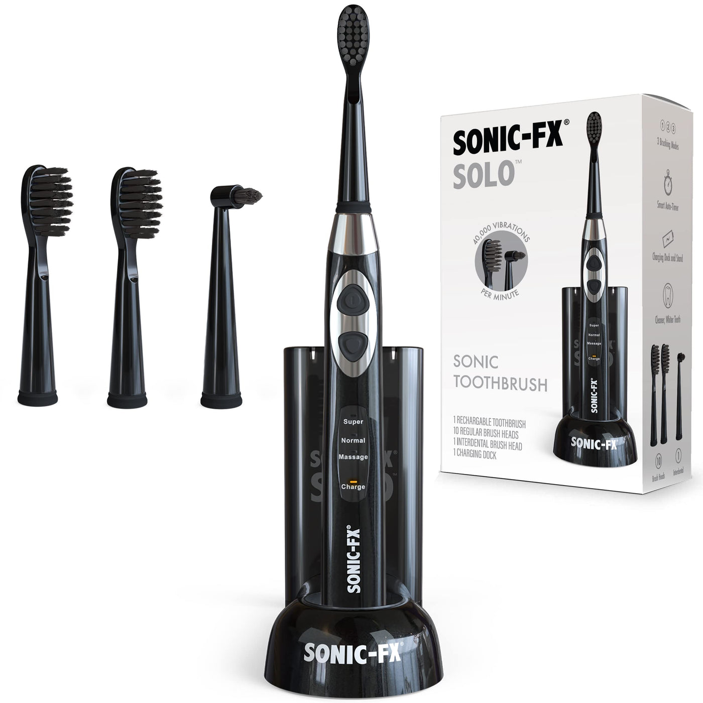 Sonic-FX Solo Electric Toothbrush - 3 Brushing Modes - with Intelligent Auto-Timer, Includes 2 Tooth Brush Heads, and 1 Interdental Head, Rechargeable, Electronic Charging/Storage Base (Black)