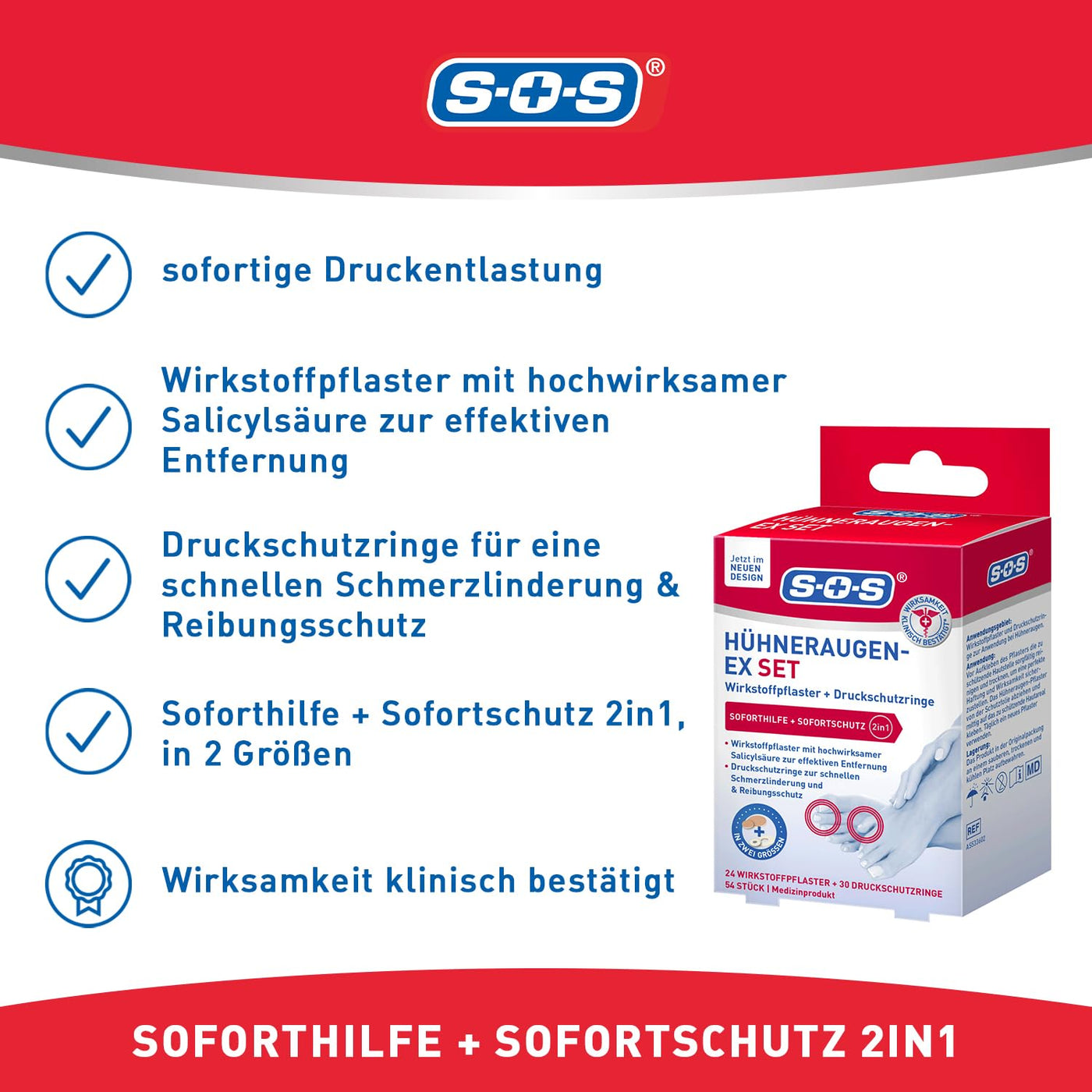 - Scope of delivery SOS corn-ex combination plaster, corn plaster and with pressure protection rings for immediate help with painful corns, 1 x 24 active ingredient plasters + 30 pressure protection rings