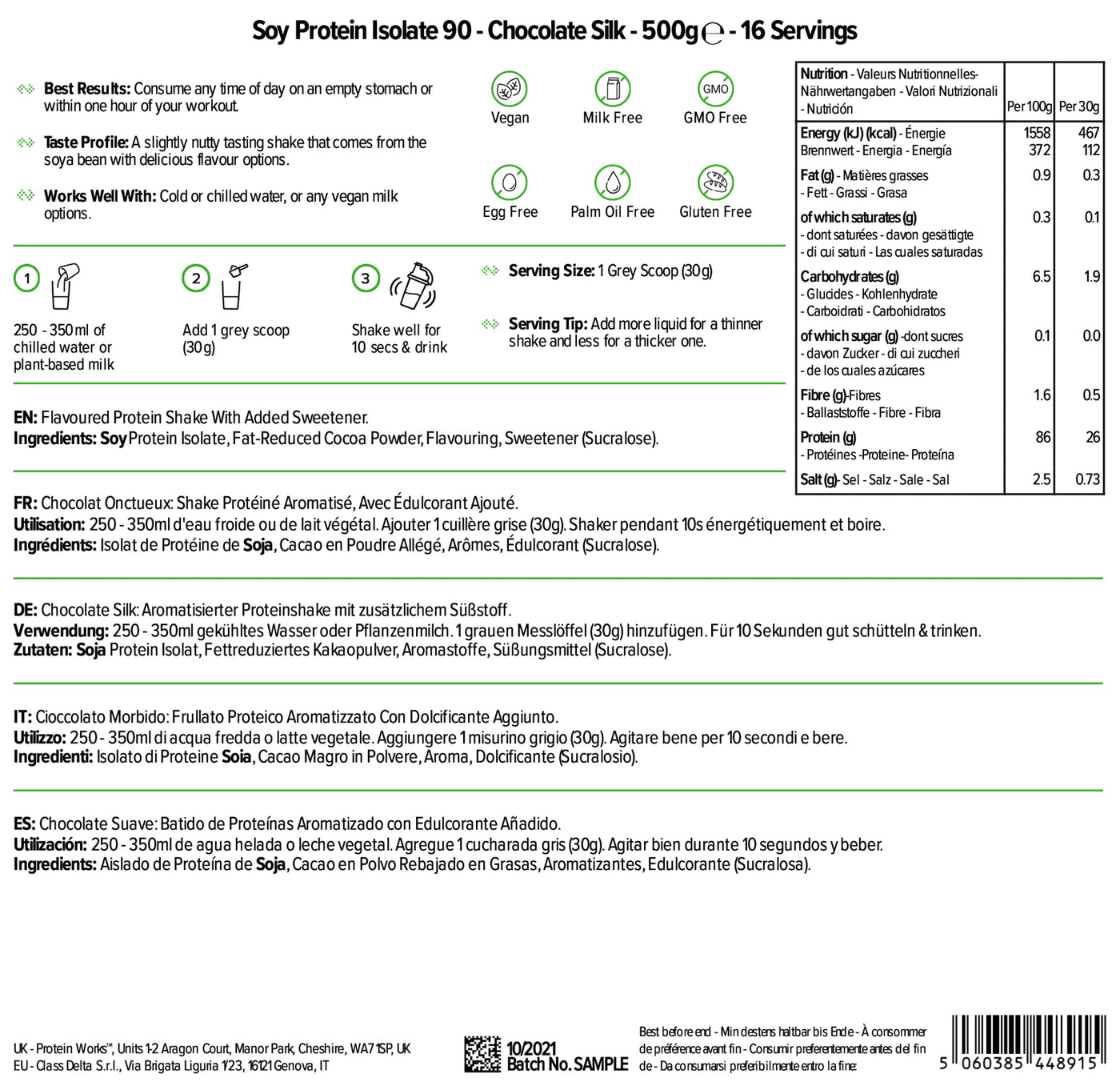 What is Soy Protein 90? Soy Protein Isolate 90 from THE PROTEIN WORKS is a 100% natural, plant-based protein shake. It is high in protein, low in fat and contains no added sugar. Each 30 g serving contains over 25 g of protein, as little as 109 calories and practically zero fat. Of all the vegetable proteins soy protein most closely resembles the amino acid profile of dairy proteins, such as whey. Therefore, it is a very popular non- dairy alternative for anyone that is looking to reduce their dairy intake, following a dairy-free diet or following a vegan or vegetarian lifestyle. As with all TPW products, Soy Protein 90 is available in a range of incredible flavours including; Choc Mint Brownie, Vanilla Crème & Strawberries ‘n’ Cream. Ingredients SOYA Protein Isolate Fat-Reduced Cocoa Powder Flavouring Sweetener (Sucralose®) Emulsifier (SOYA Lecithin) P.when('A').execute(function(A) { A.on('a:expander:toggle_description:toggle:collapse', function(data) { window.scroll(0, data.expander.$expander[0].offsetTop-100); }); }); Directions Add 250-350 ml of water or milk into your TPW Master Blender. Add one scoop (30 g), then shake and enjoy. The less water you use, the thicker your shake will be, so adjust to suit your own taste. Box Contains 1 x Soy Protein 90, Pure Soy Protein Isolate Powder, Chocolate Silk, 500 g Manufacturer Contact Information Protein Works™, Unit 5 Pembroke Court, Cheshire, WA7 1TG, UK See more