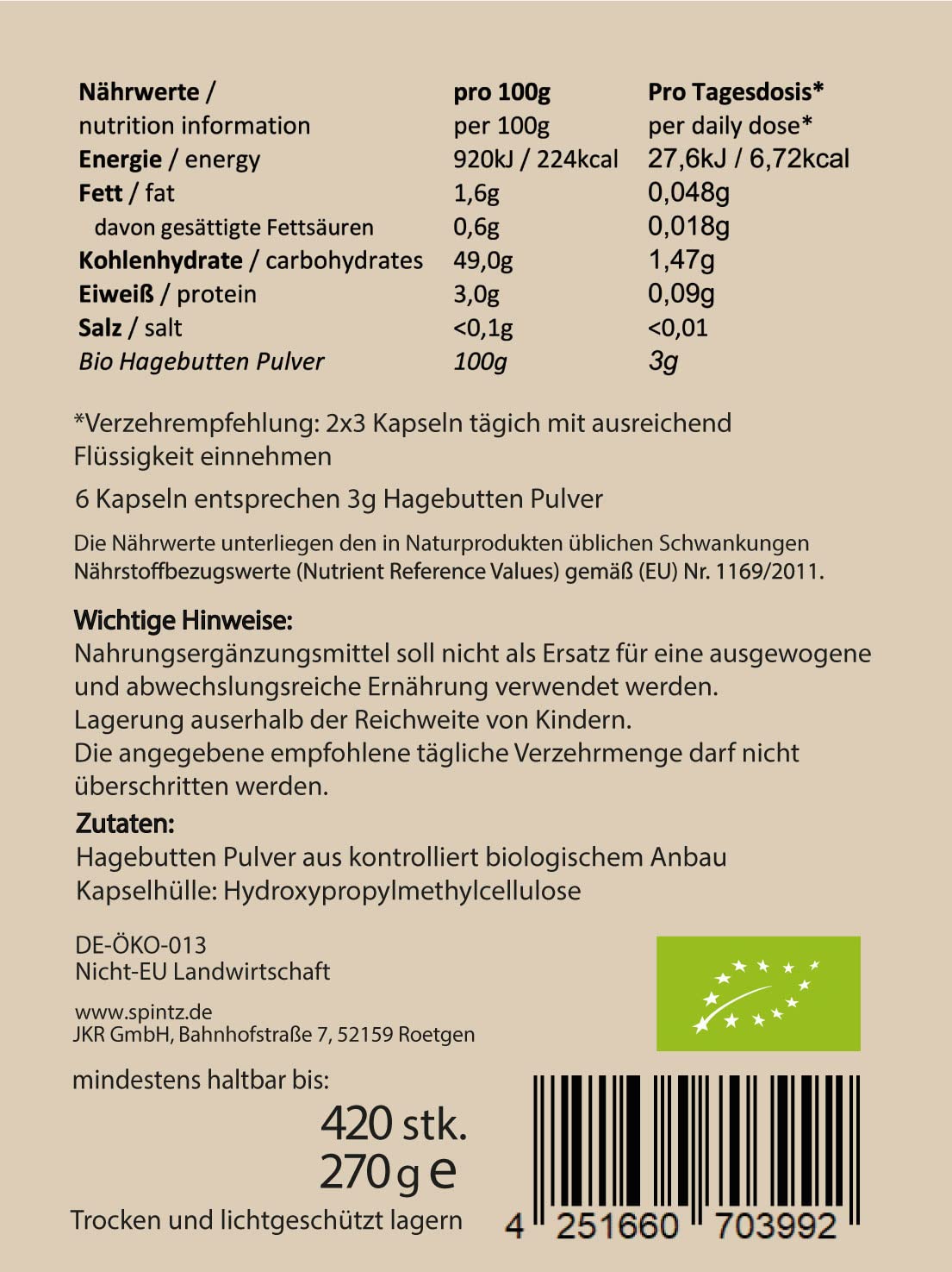 - ORGANIC - CERTIFIED: The SPINTZ organic rosehip capsules are from strictly controlled organic cultivation and certified according to EC-OKO-VO: Our claim is to meet high organic quality requirements and only produce products that are 100% free of flavors, colors and preservatives