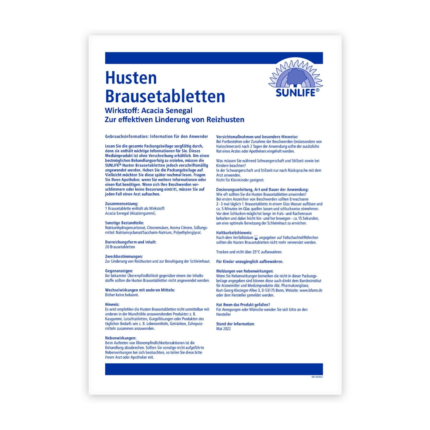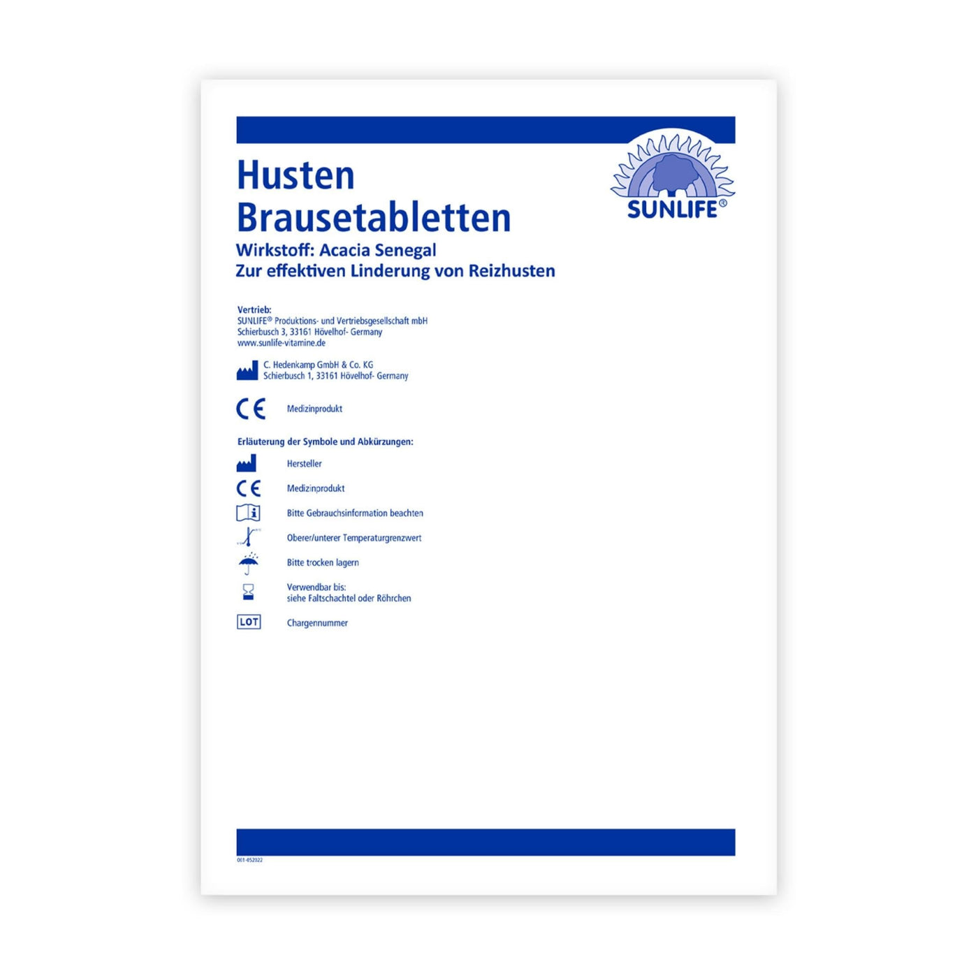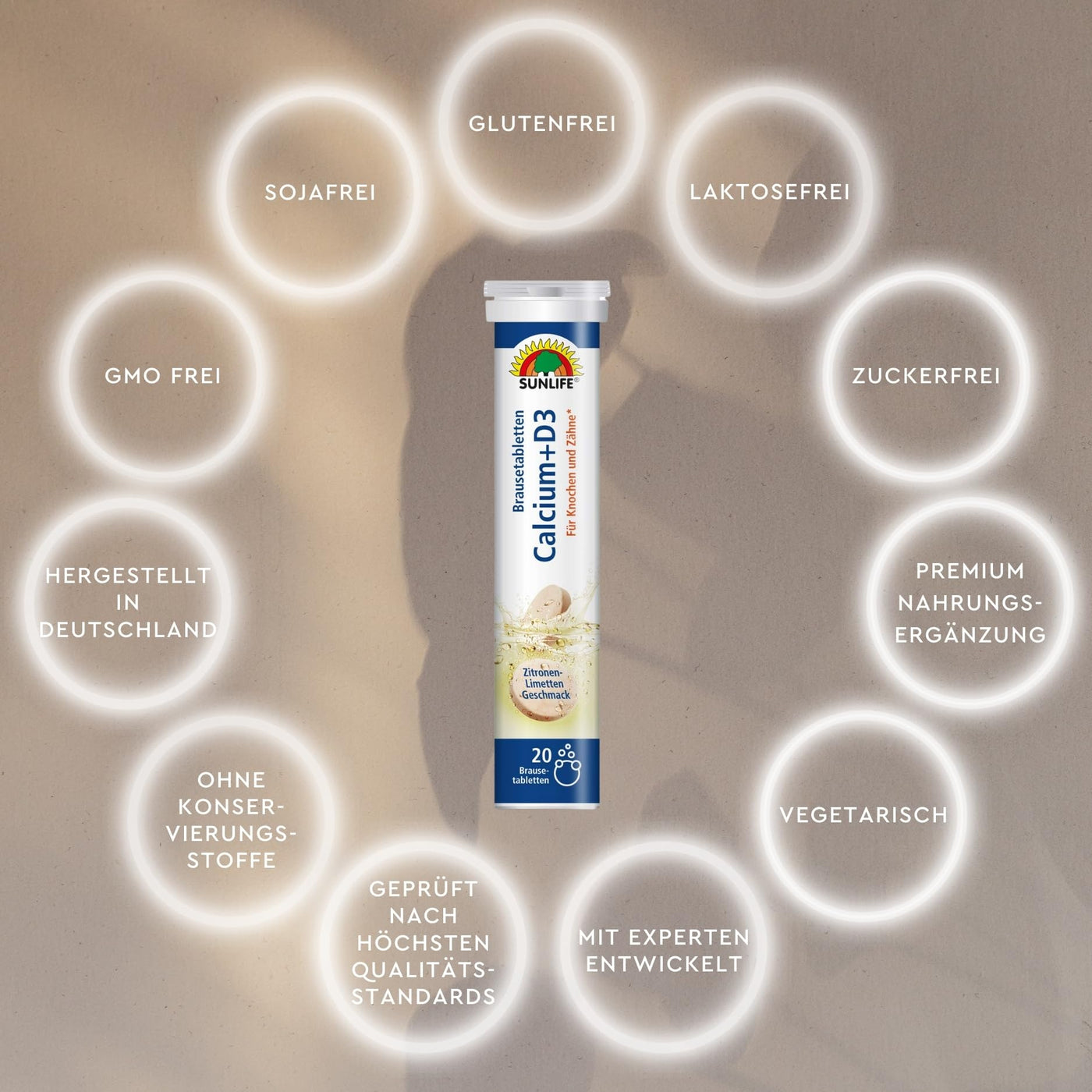Product Description Healthy bones and teeth are particularly important for people not a given at an advanced age. In addition to one A healthy diet and lifestyle can include dietary supplements help ensure that you have healthy and strong teeth for as long as possible Bones can enjoy. Calcium is used for the maintenance of normal bones and Teeth needed. Vitamin D3 contributes to normal absorption and utilization Calcium at. With fresh lemon flavor - SUNLIFE Calcium+D3 Effervescent tablets are a dietary supplement with high doses of calcium and vitamin D3. One SUNLIFE Calcium+D3 effervescent tablet twice daily Dissolve in a glass of water (250 ml) and drink. A daily dose of 2 Tablets contain 800 mg calcium and 5 µg vitamin D3. Your advantages with the SUNLIFE Calcium+D3 effervescent tablets: - Supply your body with additional nutrients for bones and teeth - easy dosage and Ingestion - Pleasantly fresh lemon taste - sugar, gluten and Lactose-free - Made in Germany - On the intake of other calcium Containing dietary supplements should be avoided. The specified one The recommended daily consumption amount must not be exceeded. Dietary supplements are not a substitute for a varied and balanced diet and a healthy lifestyle. Out of reach of Keep it away from small children. Ingredients / Ingredients Ingredients: Acidifier: citric acid; calcium carbonate, acidity regulator: sodium hydrogen carbonate; Sweetener: sodium cyclamate, corn starch, carrier: sorbitol, flavor: lemon and lime, sweetener: saccharin sodium; Vitamin D3, color: Riboflavin-5-phosphate P.when('A').execute(function(A) { A.on('a:expander:toggle_description:toggle:collapse', function(data) { window.scroll(0, data.expander.$expander[0].offsetTop-100); }); }); Instructions for use 1 effervescent tablet twice a day in a glass of water (200 ml) dissolve and drink. Address of manufacturer/importer Schierbusch 3, D-33161 Hövelhof More