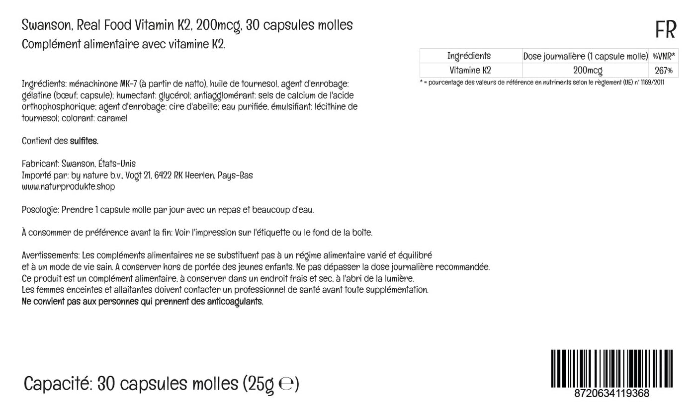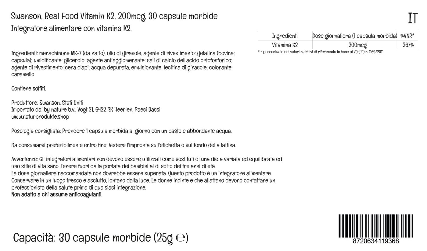 - HIGH DOSE: One dose, 1 soft capsule, Real Food K2 from Swanson contains 200mcg of vitamin K2 from natto, which you can add to your body every day