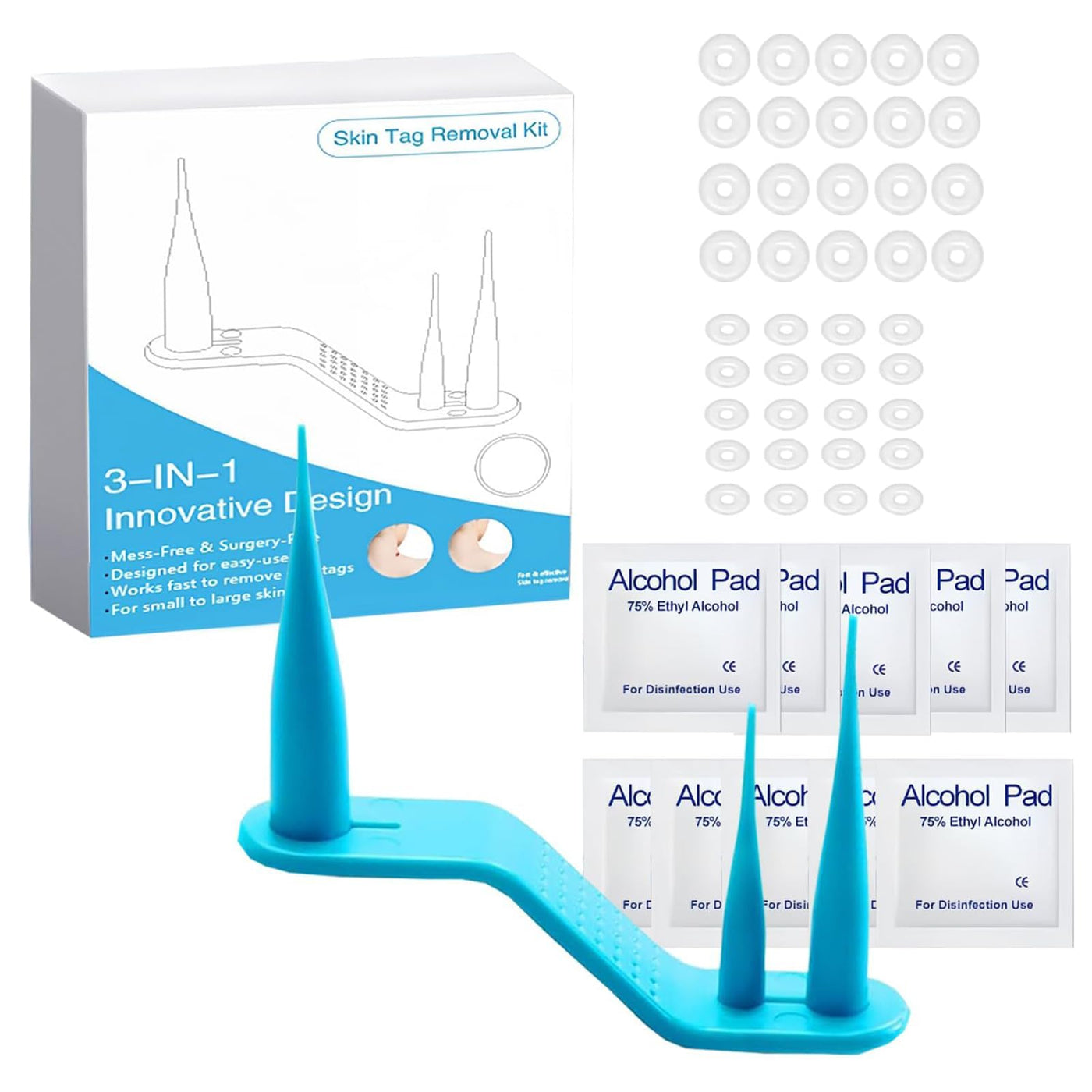 - What you get1 x skin tag removal tool,3 x skin tag remover tool,20 x normal rubber bands (4mm8mm),20 x small rubber bands (1mm4mm),10 x cleaning cloth.