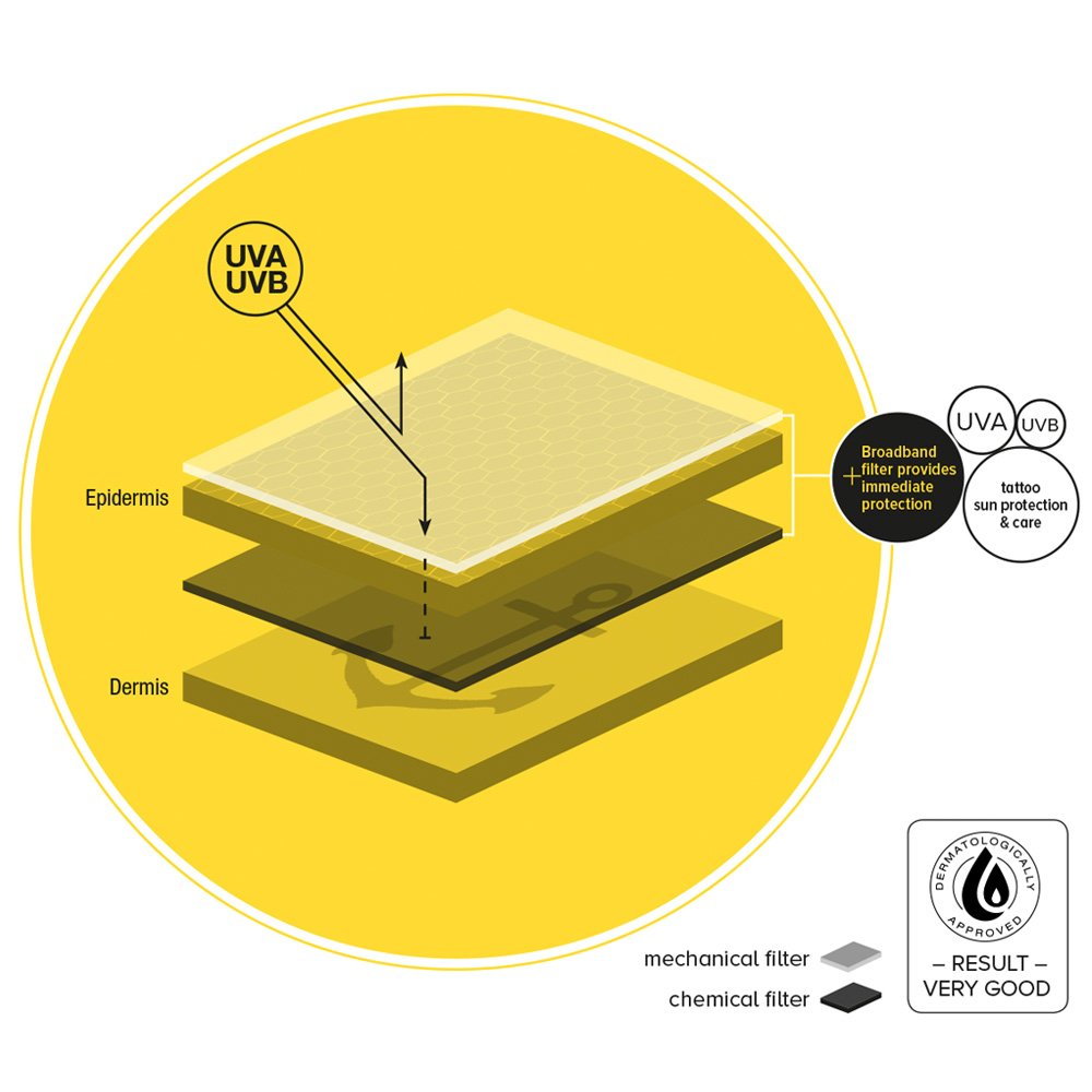 - Specially developed UVA and UVB filter provides protection for tattooed skin specifically the darker areas of the skin from UV radiation.