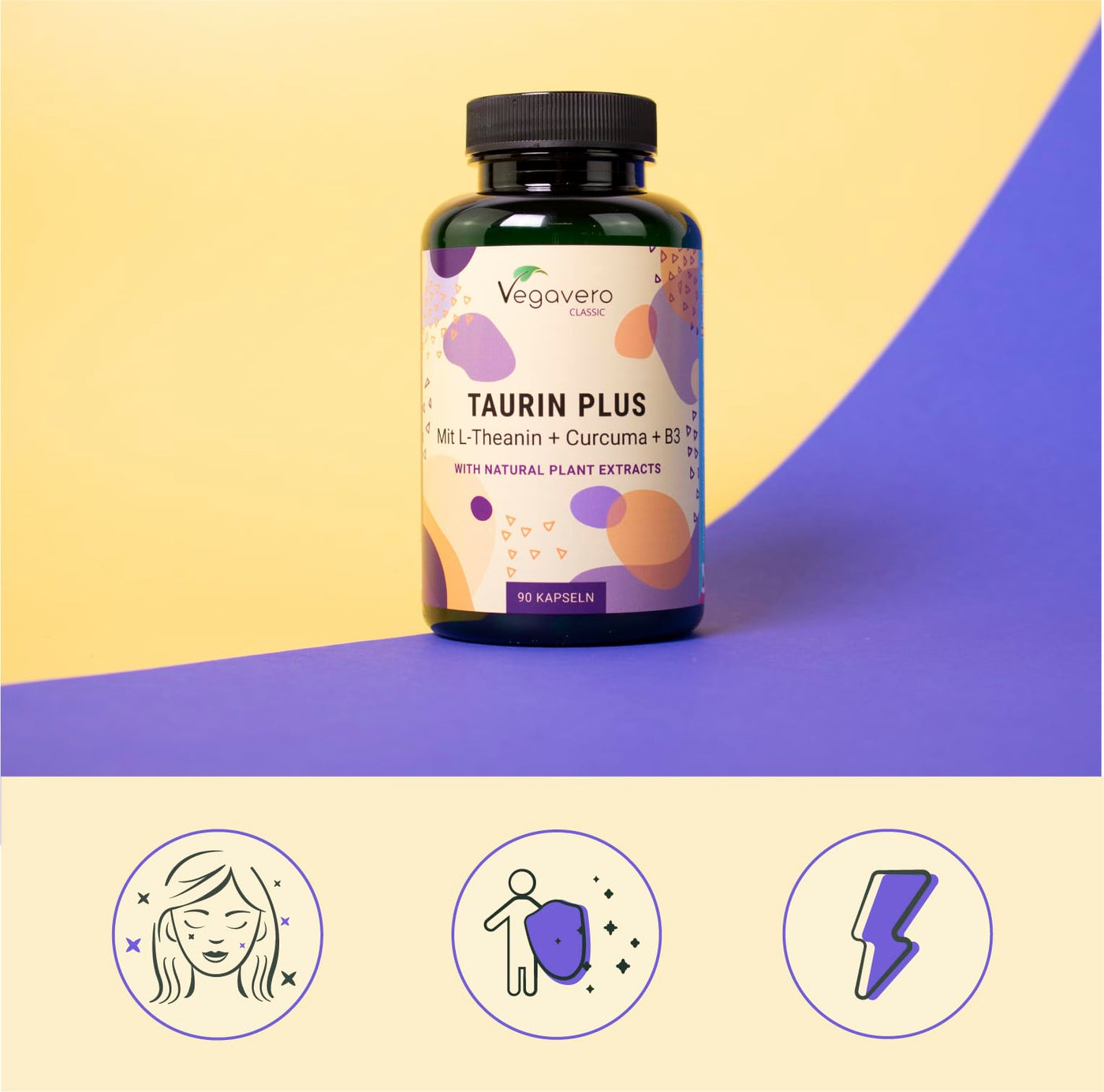 Taurine in high doses | 1000mg | With turmeric & L-theanine from green tea extract | Vegan & No Additives | 90 capsules | German production of Vegavero®