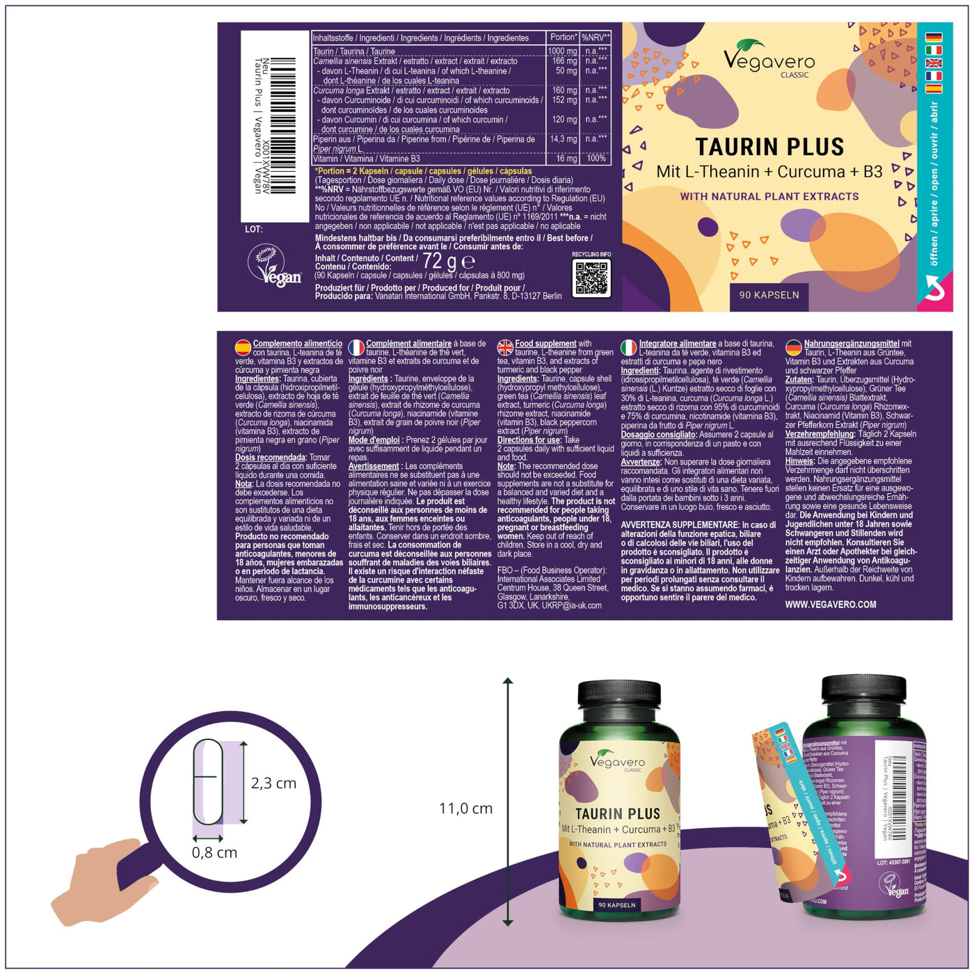 Taurine in high doses | 1000mg | With turmeric & L-Theanine from green tea extract | Vegan & Without additives | 90 capsules | German production of Vegavero®