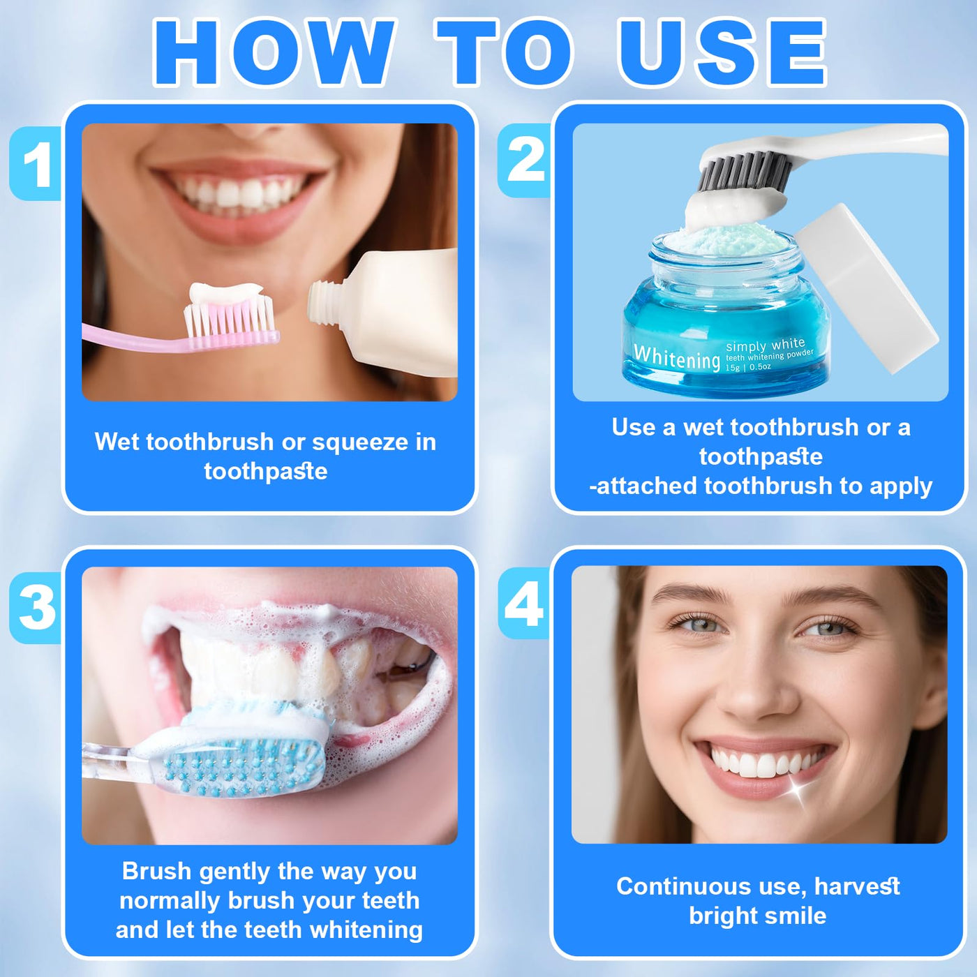 - Easy to use: No need to adjust the original brushing process, two convenient methods are available - the toothbrush can be dipped in toothpaste, lightly dipped in powder, upgraded to whitening toothpaste; or you can directly dip a wet toothbrush in the powder, make teeth whitening care simple and easy to do