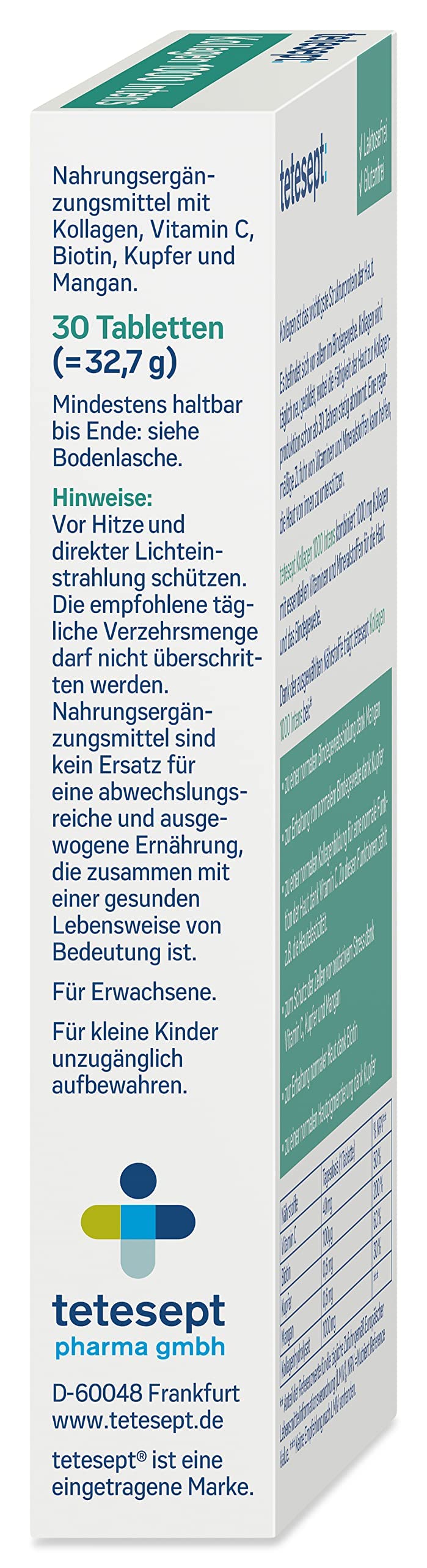 Product description tetesept Collagen 1000 Intens Collagen is the most important thing Structural protein of the skin. It is mainly found in connective tissue. Collagen is formed anew every day, increasing the skin's ability to produce collagen decreases steadily from the age of 30 onwards. A regular supply of vitamins and Minerals can help support the skin from within. tetesept Collagen 1000 Intens combines 1000mg of collagen with essential vitamins and Minerals for the skin and that Connective tissue.Product informationSelected nutrients, high dosesWith Collagen, vitamin C, biotin, copper and manganese for a beautiful Skin condition.Gluten & Lactose-free Recommended consumption: 1 tablet once daily Consume enough liquid without chewing. Notes: Keep away from heat and direct contact Protect from light radiation. The recommended daily consumption amount may not be exceeded. Dietary supplements are not a substitute for one varied and balanced diet, along with a healthy diet lifestyle is important. Keep out of the reach of small children. For Adults.About teteseptThe tetesept brand has stood out for over 50 years through the effective combination of traditional medicine with modern medicine medical-scientific findings. Innovative recipes and a separate department for research and development is the basis for one large selection of care and health products. These include bath additives, Shower and foot care products as well as cold preparations, vitamins & Minerals and self-medication products. tetesept: for the holistic Well-being and daily active health care. Ingredients / Ingredients Collagen hydrolyzate (91.7%); ascorbic acid (vitamin C); Coating agent: hydroxypropylmethylcellulose; Release agent: magnesium salts fatty acids, talc; Coating agent: hydroxypropyl cellulose; Dye: iron oxide red, calcium carbonate; manganese(II) sulfate monohydrate; copper(II) sulfate; oil, vegetable (coconut); D-biotin. P.when('A').execute(function(A) { A.on('a:expander:toggle_description:toggle:collapse', function(data) { window.scroll(0, data.expander.$expander[0].offsetTop-100); }); }); Address Manufacturer/Importer Eckenheimer Landstrasse 100, 60318 Frankfurt More