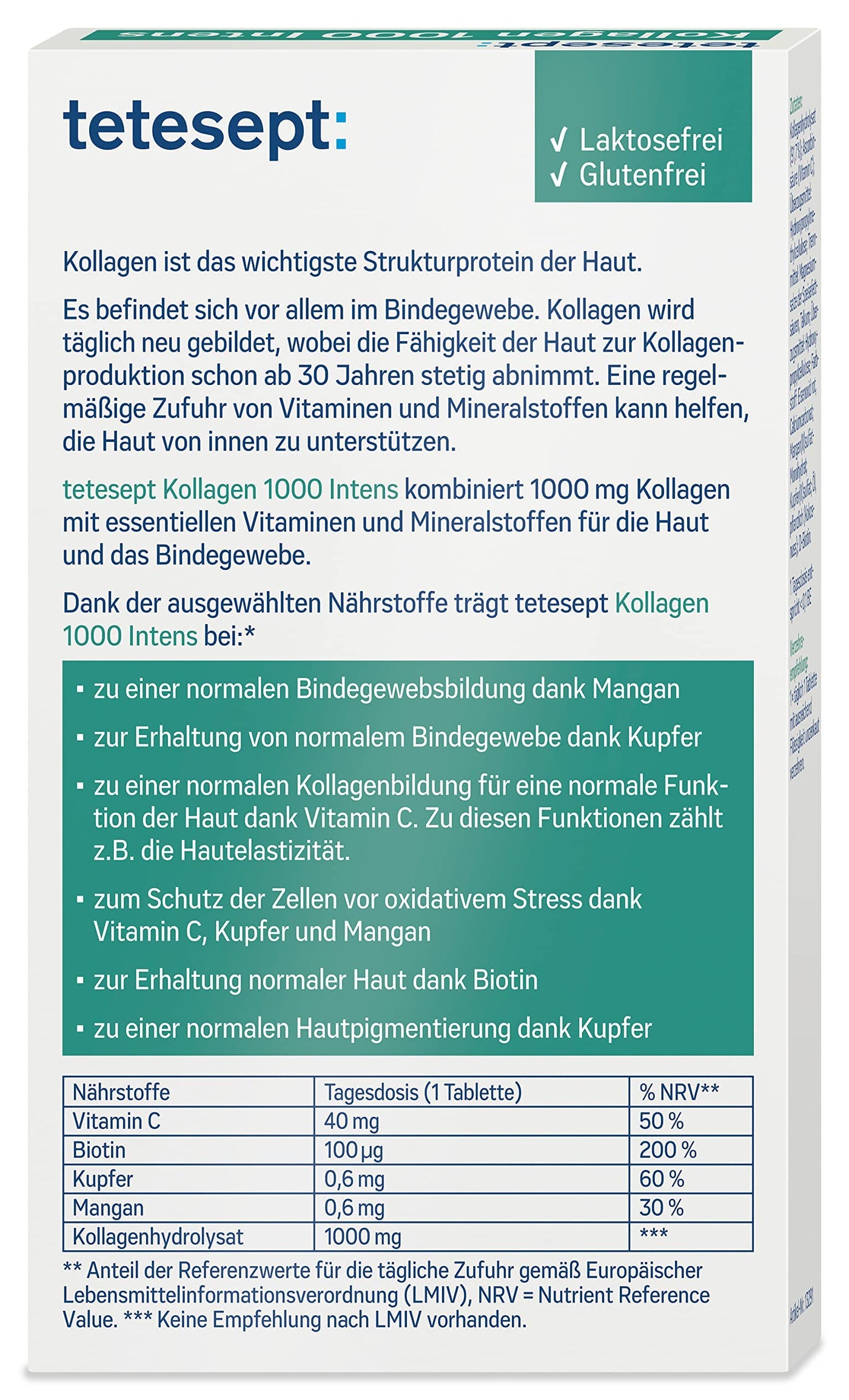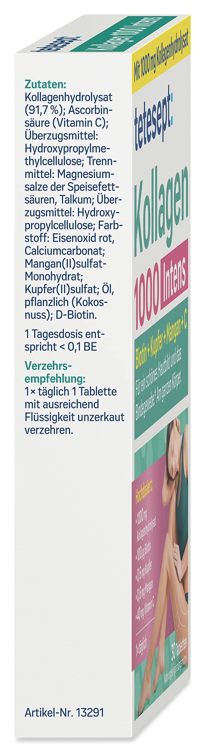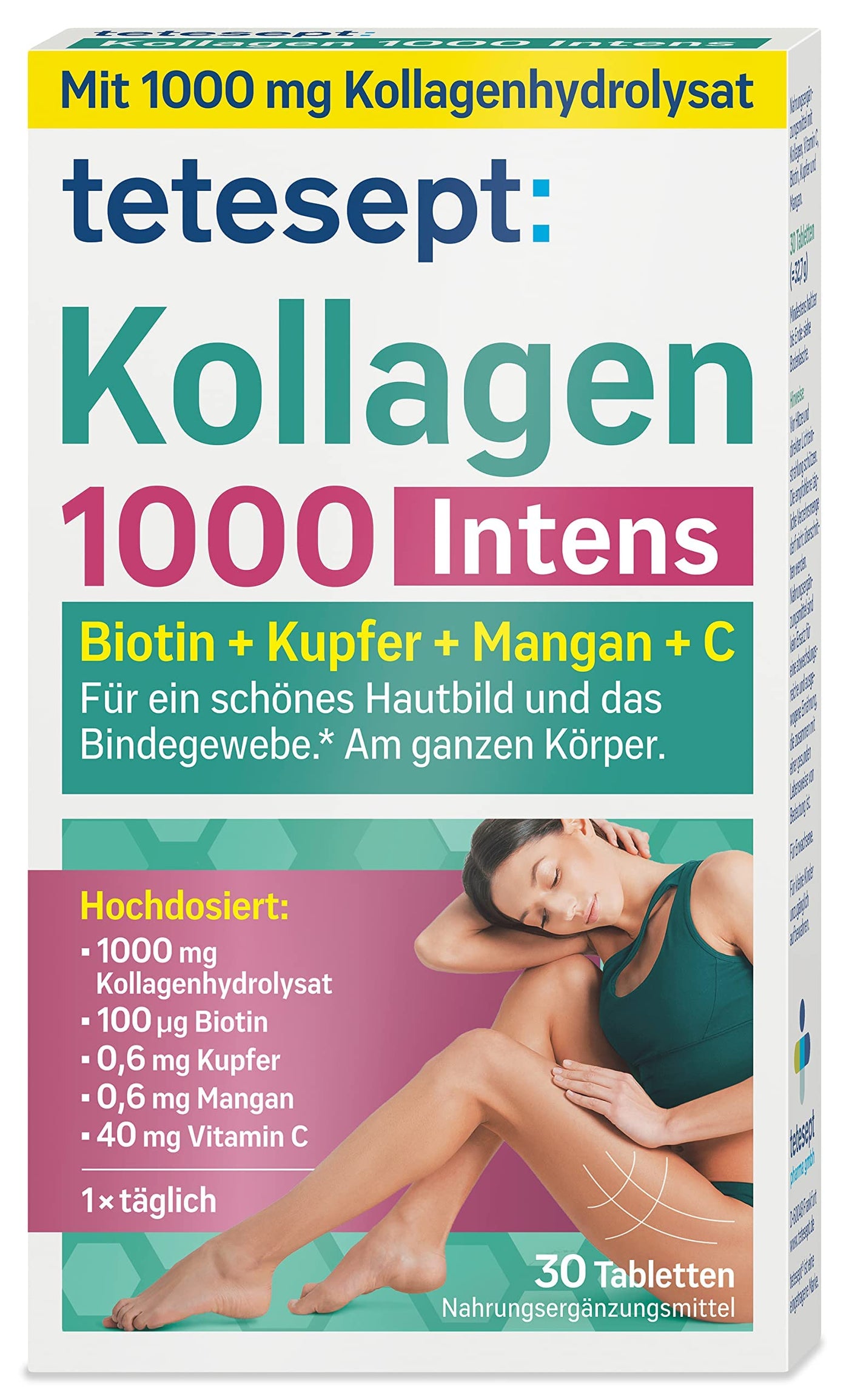 - Scope of delivery: 1x 30 tablets of tetesept Collagen 1000 Intens - for skin elasticity and connective tissue thanks to vitamin C, copper, collagen and manganese - high dosage