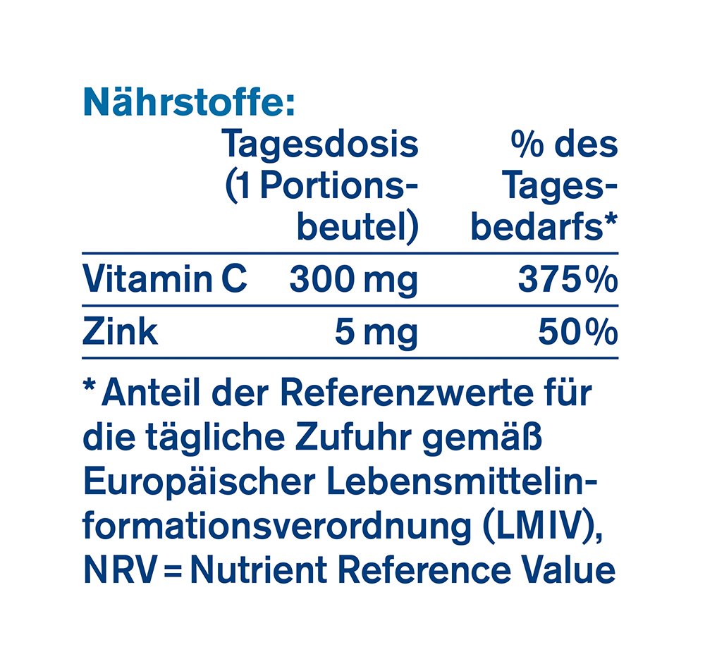 - Thanks to the high-dose nutrient combination of 300 mg vitamin C and 5 mg zinc, the daily requirement is covered with just one serving