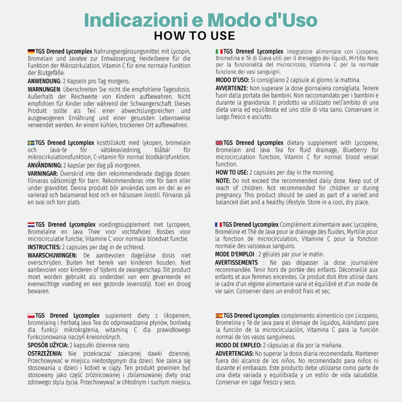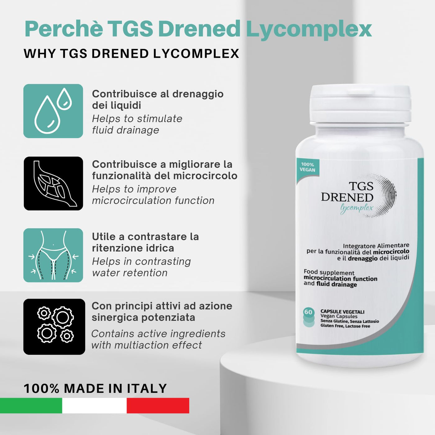 - Safe and made in Italy: TGS Drened Lycomplex is made in Italy at the Licofarma S.r.l. production facility. Manufactured in compliance with all quality and safety standards.