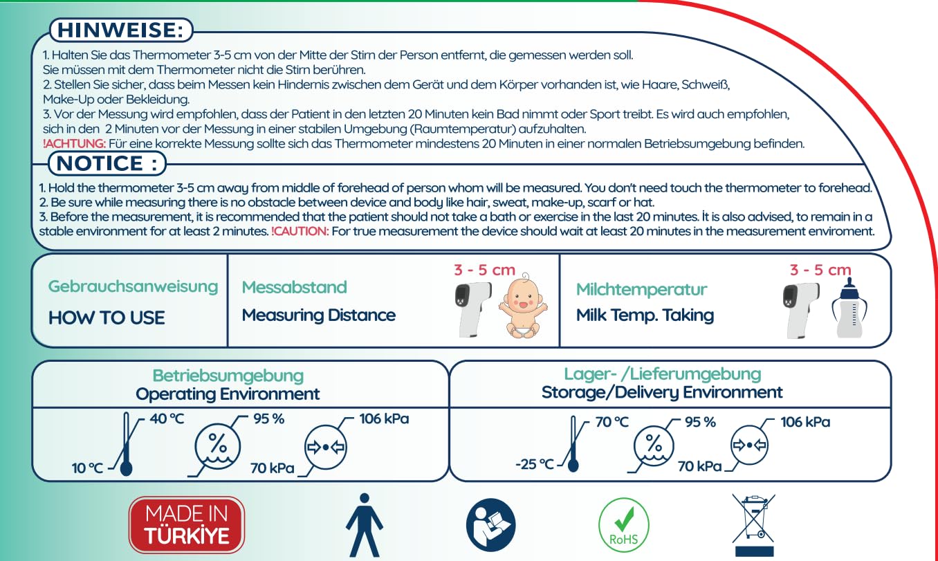 Fever thermometer Made in Turkey | for children, adults & Baby milk | Precise medical device | Contactless | Infrared | Digital | LCD | Fever warning | Object & Body temperature | including batteries