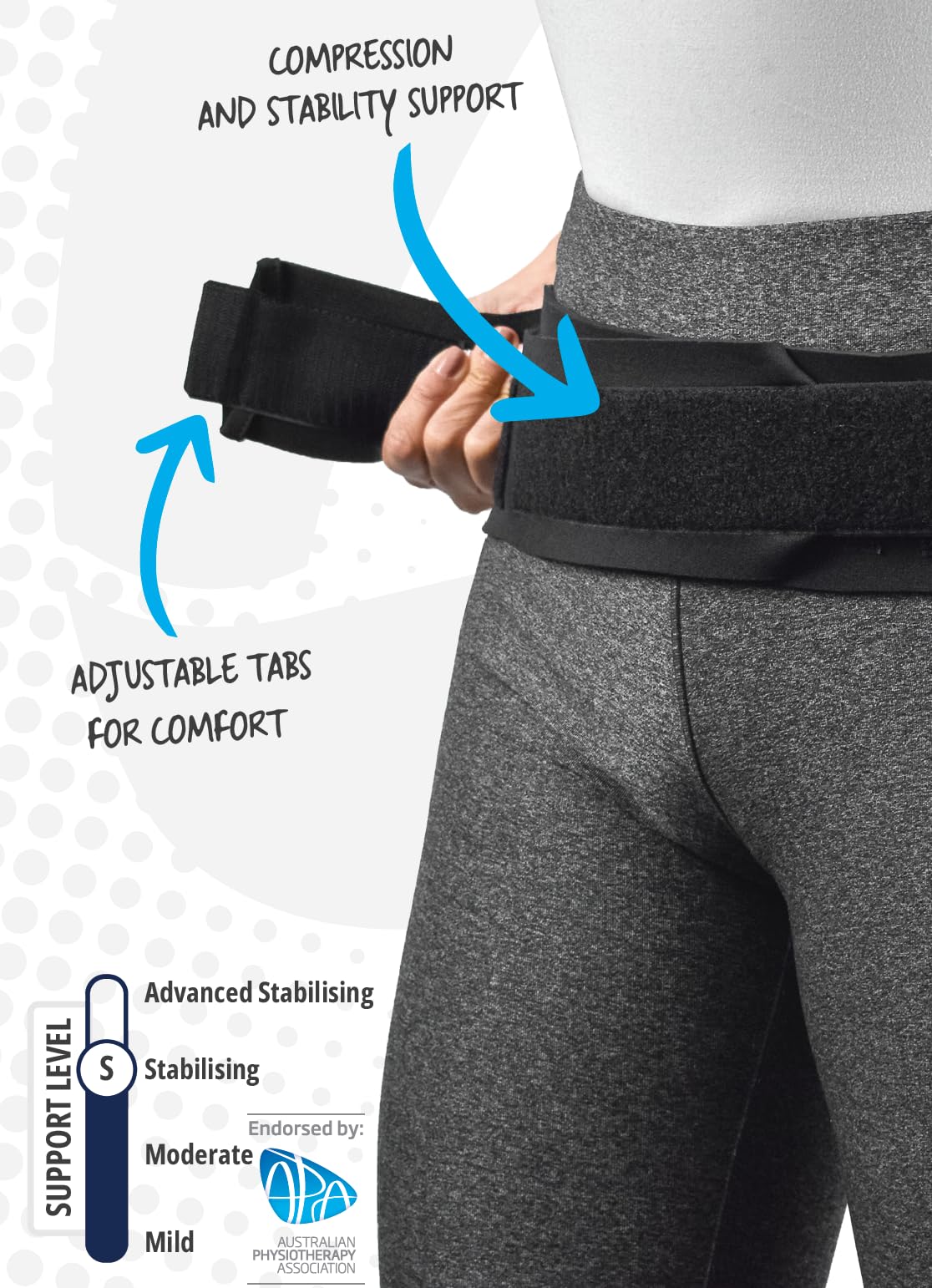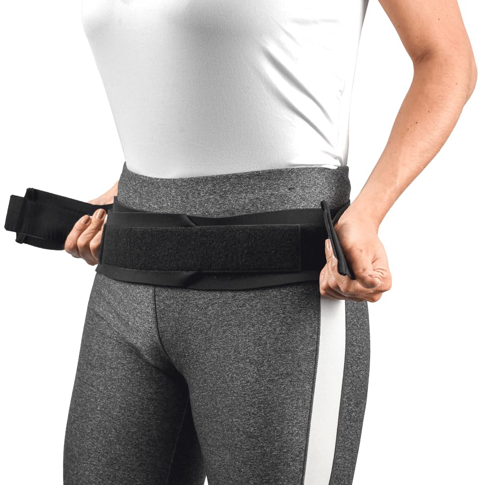 Sacroiliac Belt provides stabilization of the sacroiliac joint through direct compression. Adjustable wrap-around design is easy to apply for a comfortable fit and controlled compression. Secondary elastic side straps allow you to adjust and customize the amount of support needed. Low profile, contoured design fits easily under clothing allowing for comfortable all day wear.