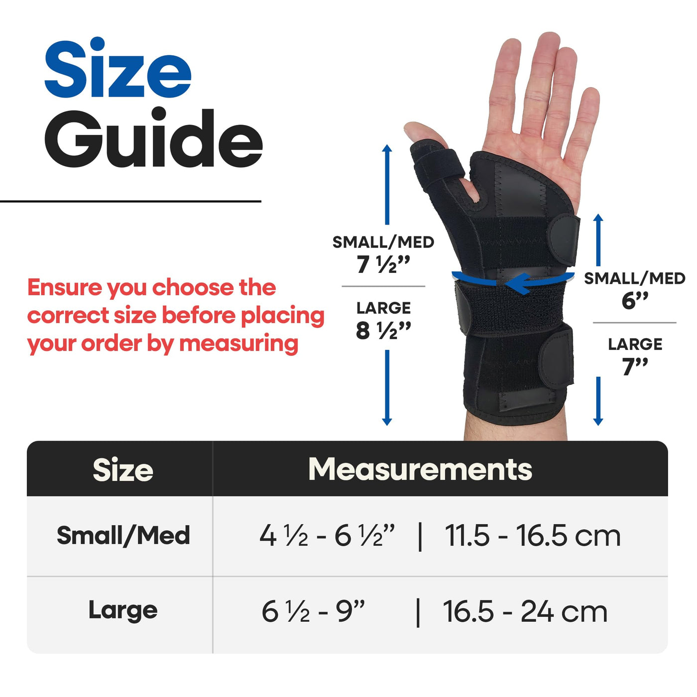 - THUMB SPICA BRACE & WRIST SPLINT: Acts both as a thumb stabilizer to support thumb joint & wrist brace to protect wrist injuries, carpal tunnel syndrome, wrist tendonitis or wrist arthritis. Thumb splint for right hand & left hand options, 2 sizes. PLEASE DON'T ASSUME YOUR SIZE - MEASURE BEFORE ORDERING