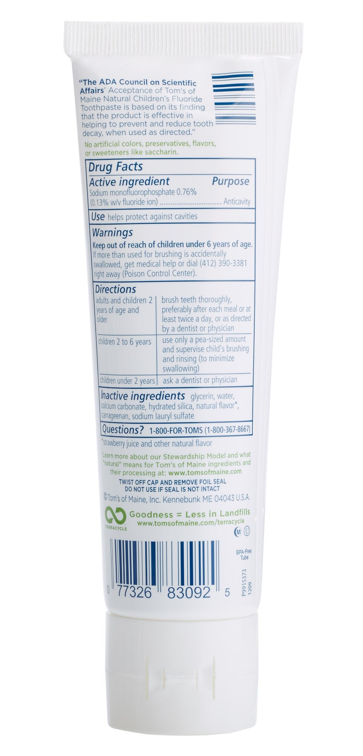 Tom's of Maine uses naturally sourced, naturally derived ingredients to create personal care products that work. A kids toothpaste parents trust, Toms toothpaste for kids is a natural toothpaste that uses calcium and silica to clean teeth. Ingredients: Sodium Monofluorophosphate 0.76 percent (0.13 percent W/V Fluoride Ion), Glycerin, Water, Calcium carbonate, Hydrated Silica, Natural Flavor, Carrageenan, Sodium Lauryl Sulfate.
